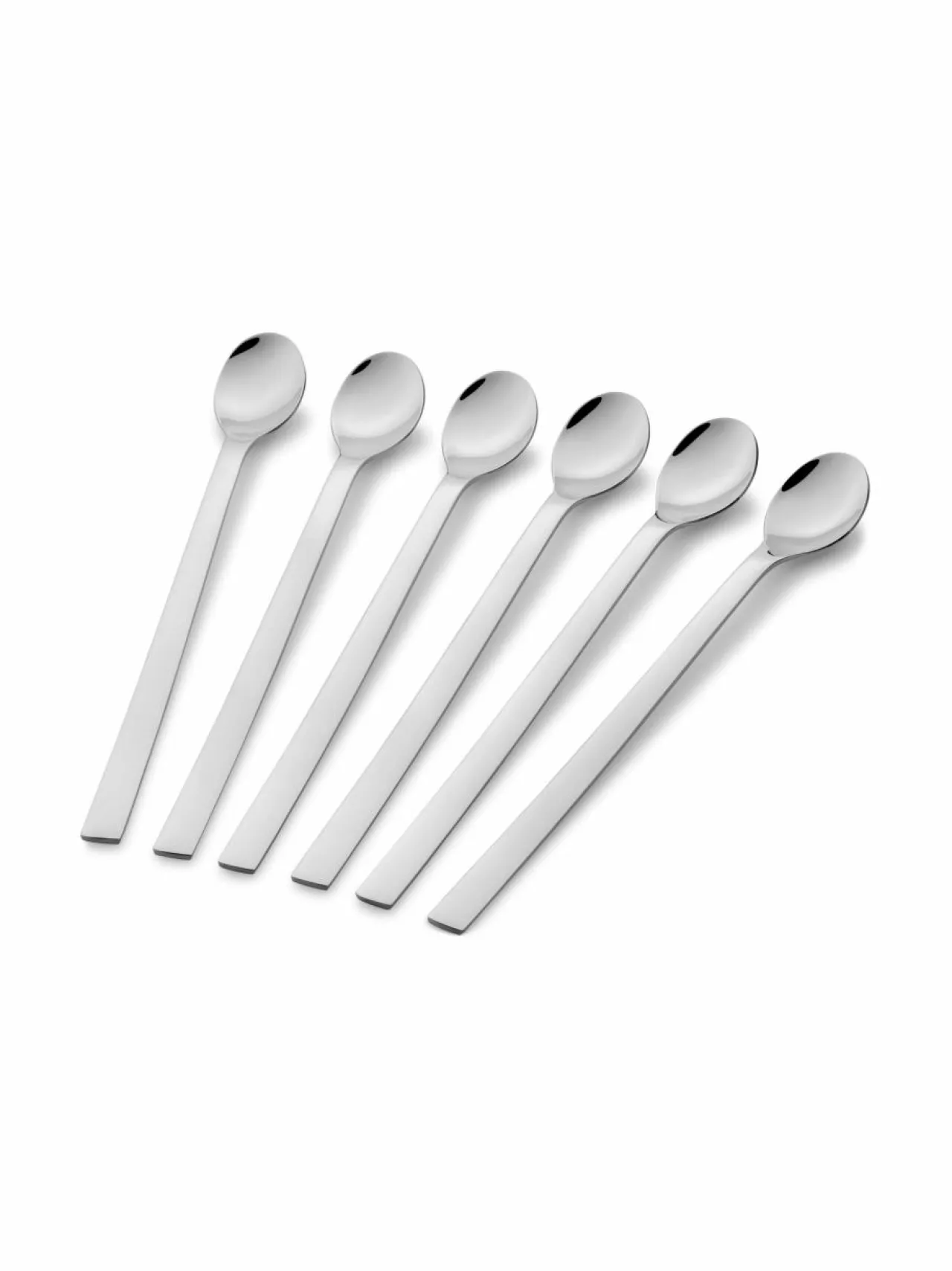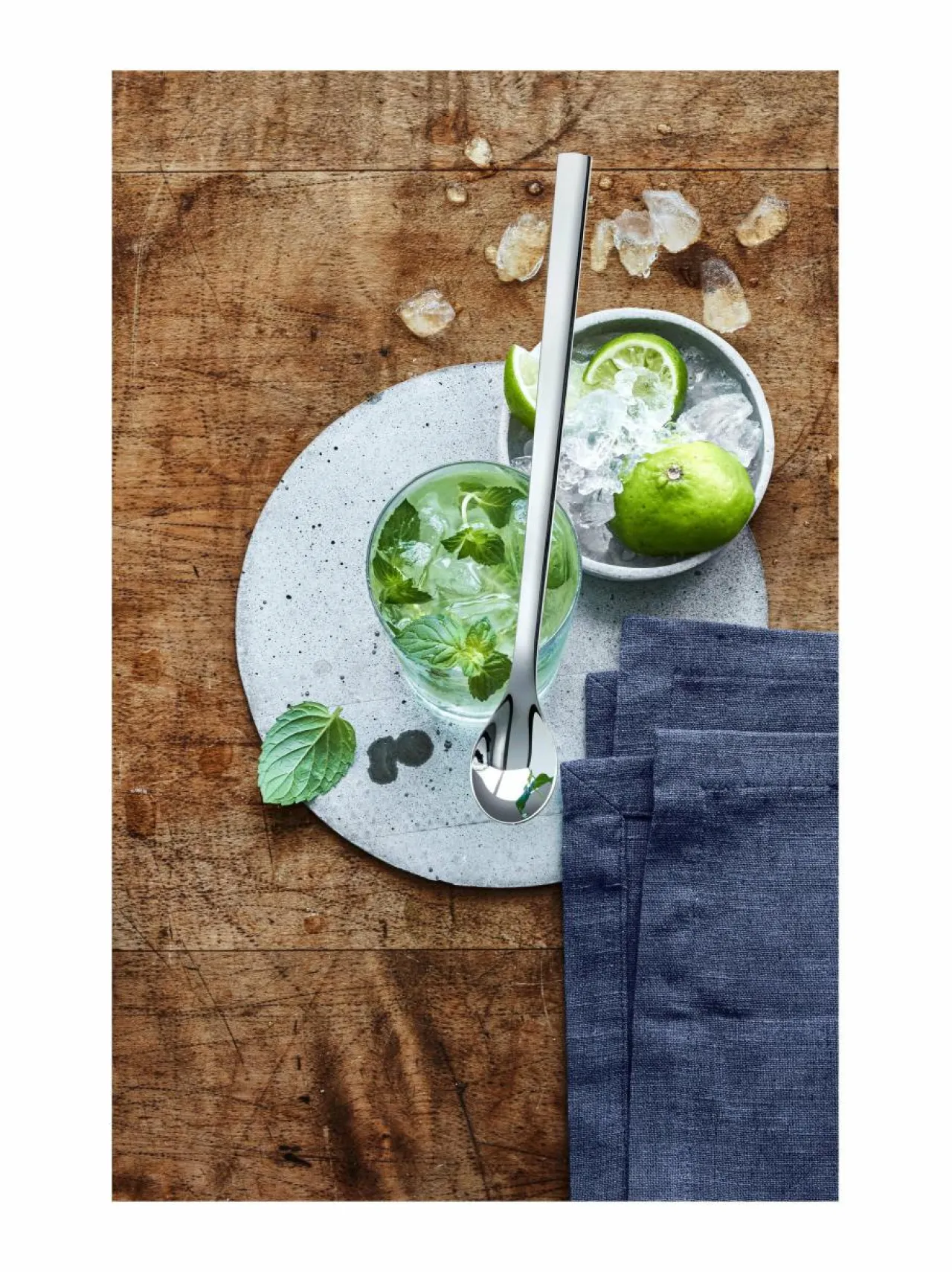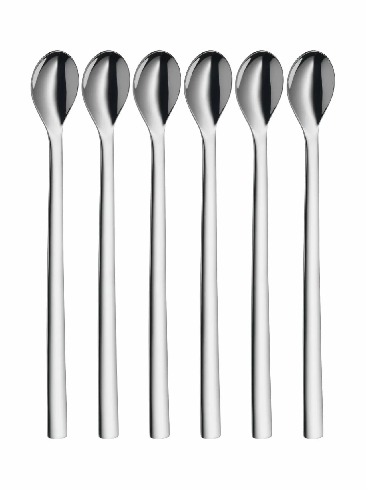 Long drink -juoman tarjoiluun tarvitaan tyylikäs, pitkä lusikka, joka sopii korkean ja ohuen juomalasin tai highball-lasin tyyliin ja jolla voit helposti sekoittaa cocktailit, mehut ja jäät. WMF Nuova Longdrink -lusikoiden valmistuksessa on käytetty korkealaatuista ruostumatonta Cromargan® 18/10 -terästä. Lusikat ovat konepesun kestäviä. Setti sisältää kuusi lusikkaa ja niiden pituus on 22 cm.