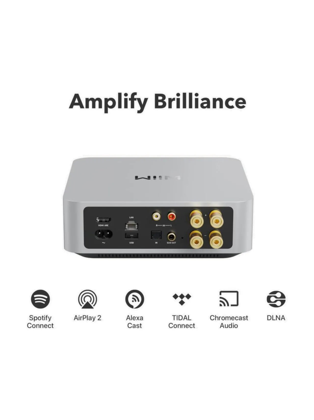 Korkealaatuinen Ääni: Wiim Amp tukee Hi-Res Audio -toistoa jopa 192 kHz / 24-bit, tarjoten erittäin tarkan ja rikkaan äänentoiston.