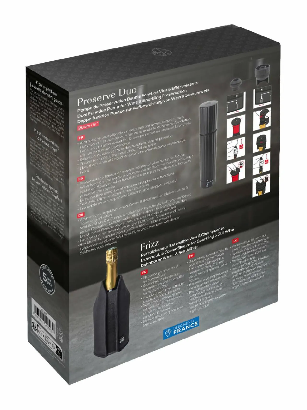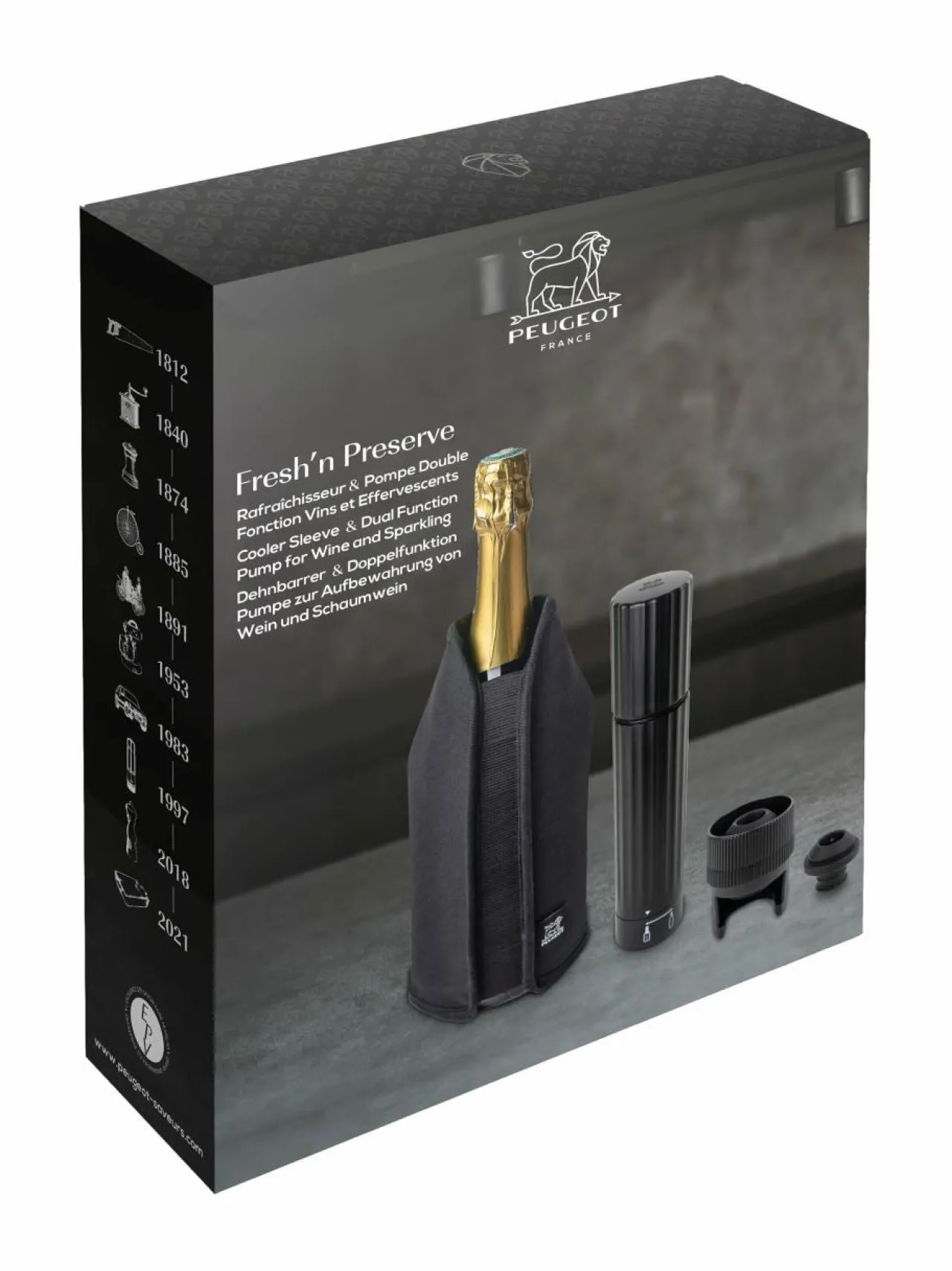 Fresh’n Preserve -lahjapakkaus Peugeot-merkiltä. Tämä elegantti lahjapakkaus on täydellinen valinta viinin ystävälle. Setti sisältää FRIZZ-jäähdytysholkin, joka pitää juoman kylmänä pitkään, sekä Preserve Duo -viinipumpun, jolla voit säilyttää sekä viinin että kuohuviinin tuoreena useamman päivän. Mukana tulevat myös viini- ja kuohuviinitulppa. Setti on täydellinen lahja, joka takaa, että suosikkijuomasi säilyy raikkaana ja aromaattisena pitkään.