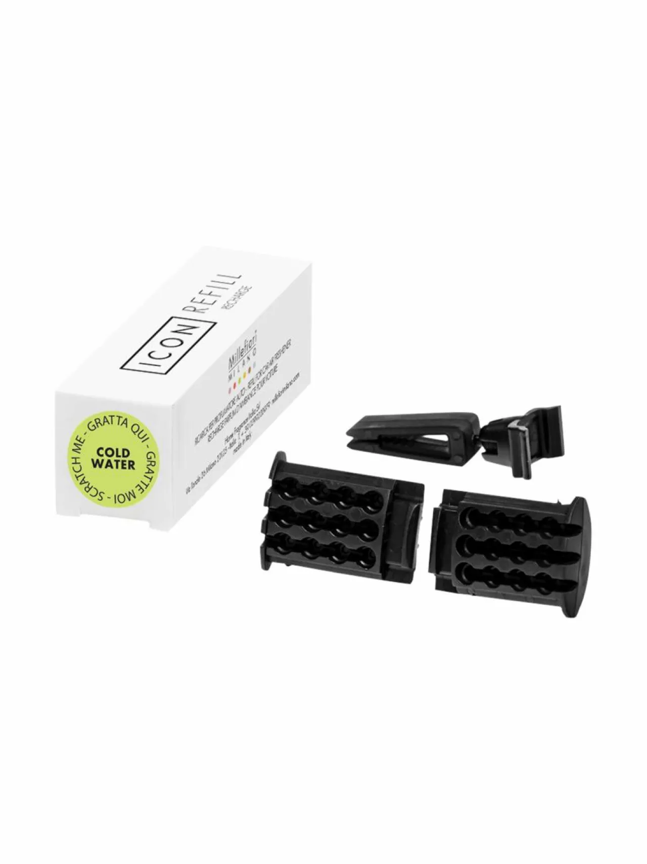 Täyttöpakkauksessa on tuoksukapseli ja kiinnitysklipsi auton Millefiori Icon -ilmanraikastimeen.Tuotenumero151776700 MateriaaliEVA-muovia VäriNOCOL