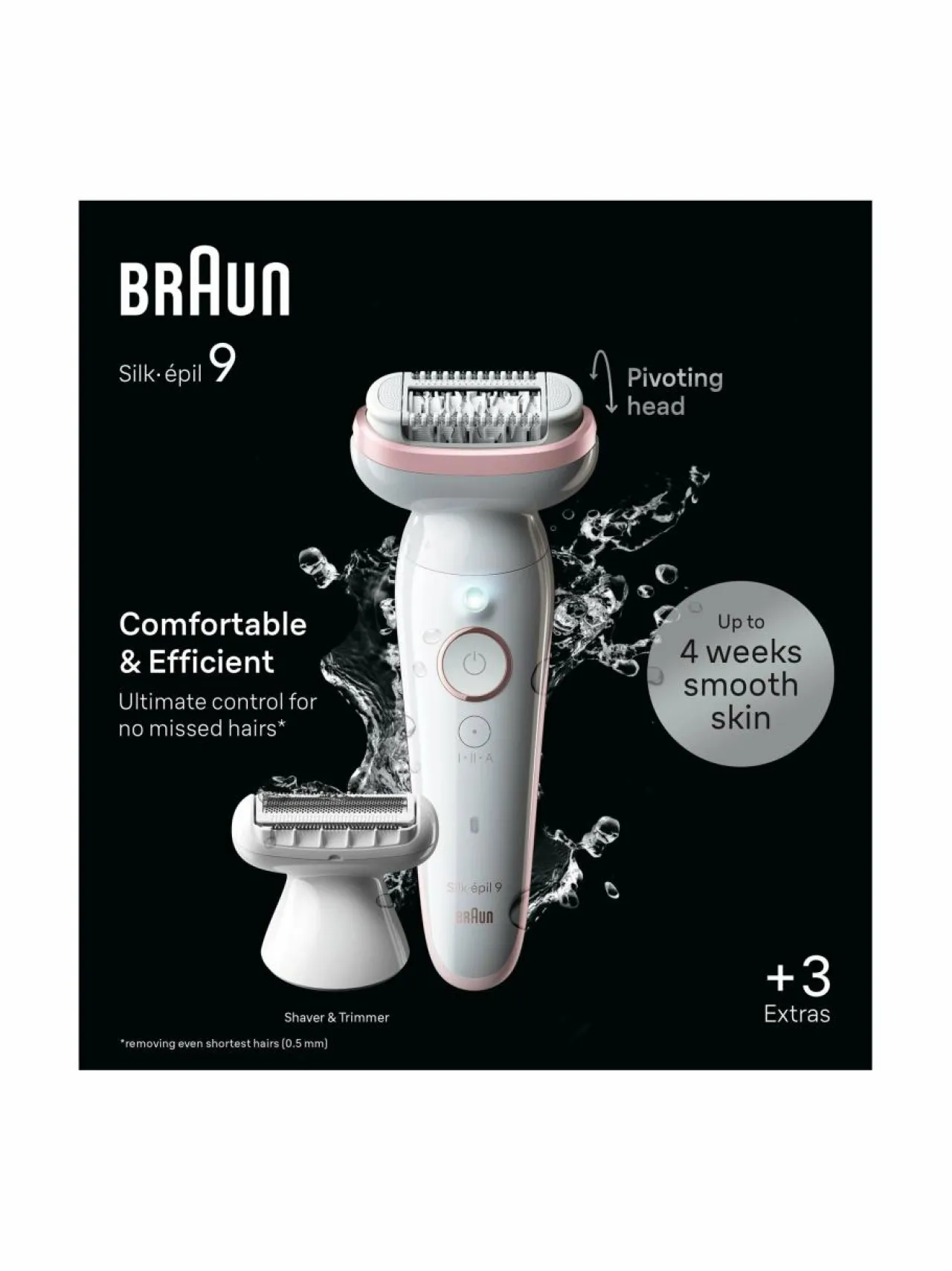 Langaton Braun Silk-épil 9 -epilaattori tarjoaa kätevän märkä- ja kuivakäytön, 50 minuutin käyttöajan, MicroGrip-teknologian 40 pinsetillä, kääntyvän pään ja useita lisävarusteita sileän ihon saavuttamiseksi jopa kuukauden ajaksi.