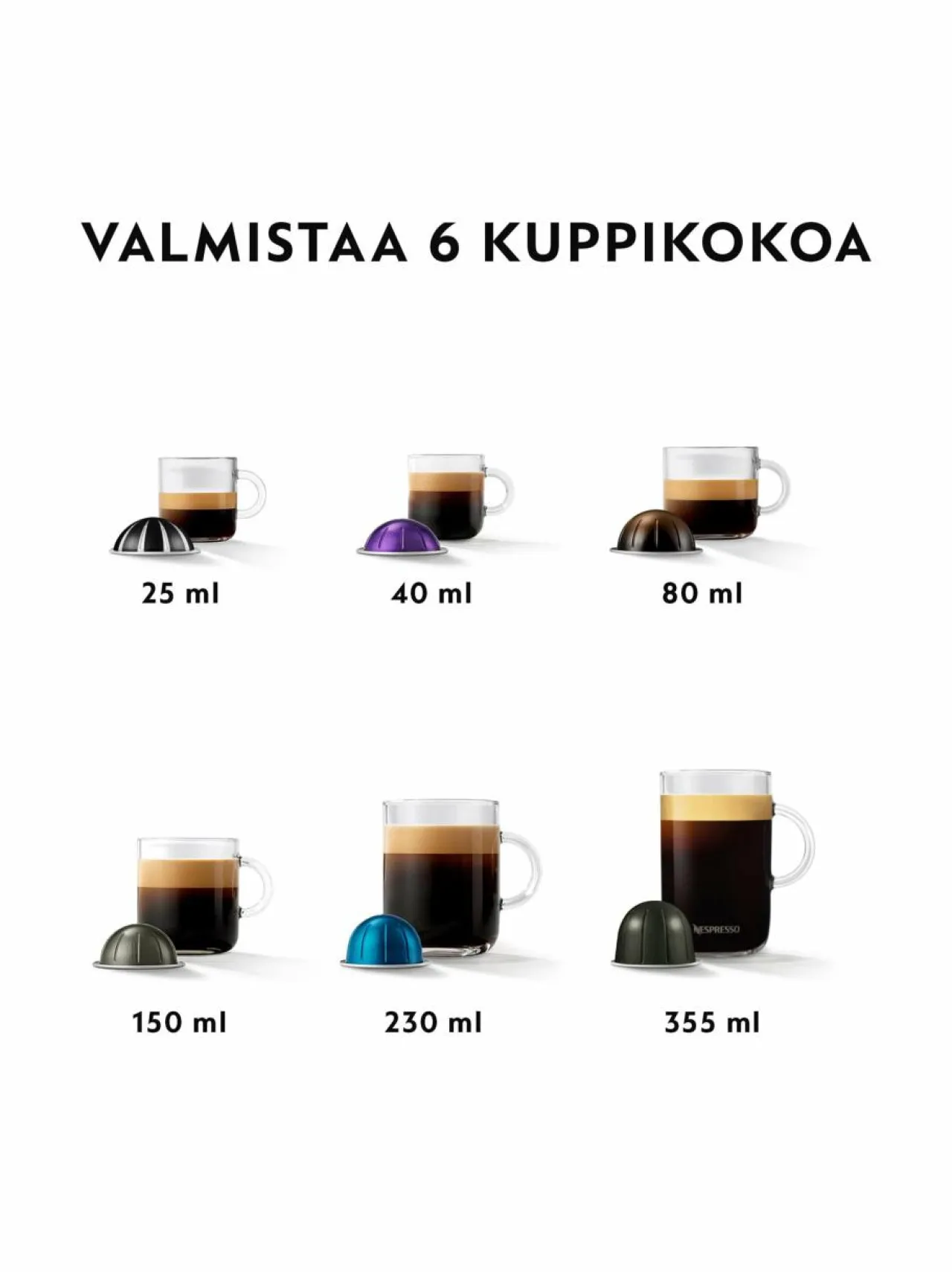 Myyntipakkaus sisältää 12 kapselin maistelupakkauksen.- Kuusi kahvikokoa: Alto 355 ml, Mug 230 ml, Gran Lungo 150 ml, Double Espresso 80 ml, Espresso 40 ml, Ristretto 25 ml