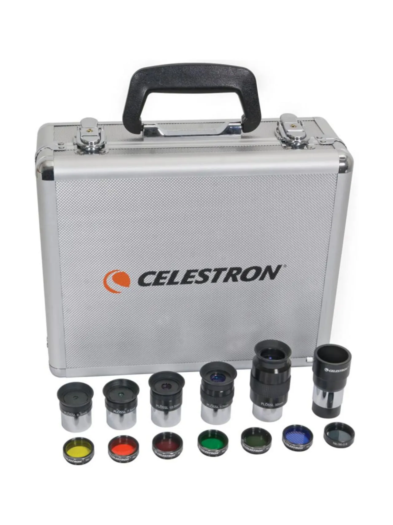 Erittäin laaja lisävarustepakkaus kaukoputken käyttäjälle. Varusteet tulevat tyylikkäässä ja kestävässä metallisalkussa. Okulaarien kiinitys on yleinen 1.25 ja nämä menee kiinni kaikkiin meidän valikoimissa oleviin Celestron kaukoputkiin kuten myös muiden valmistajien laitteisiin.