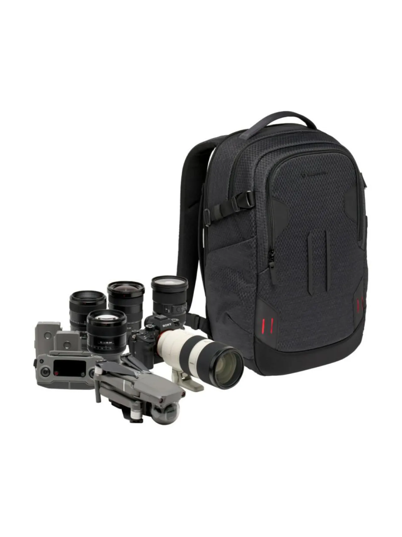 Reppuun mahtuu 1 x DSLR runko, 4 linssiä, drone ja tarvikkeet