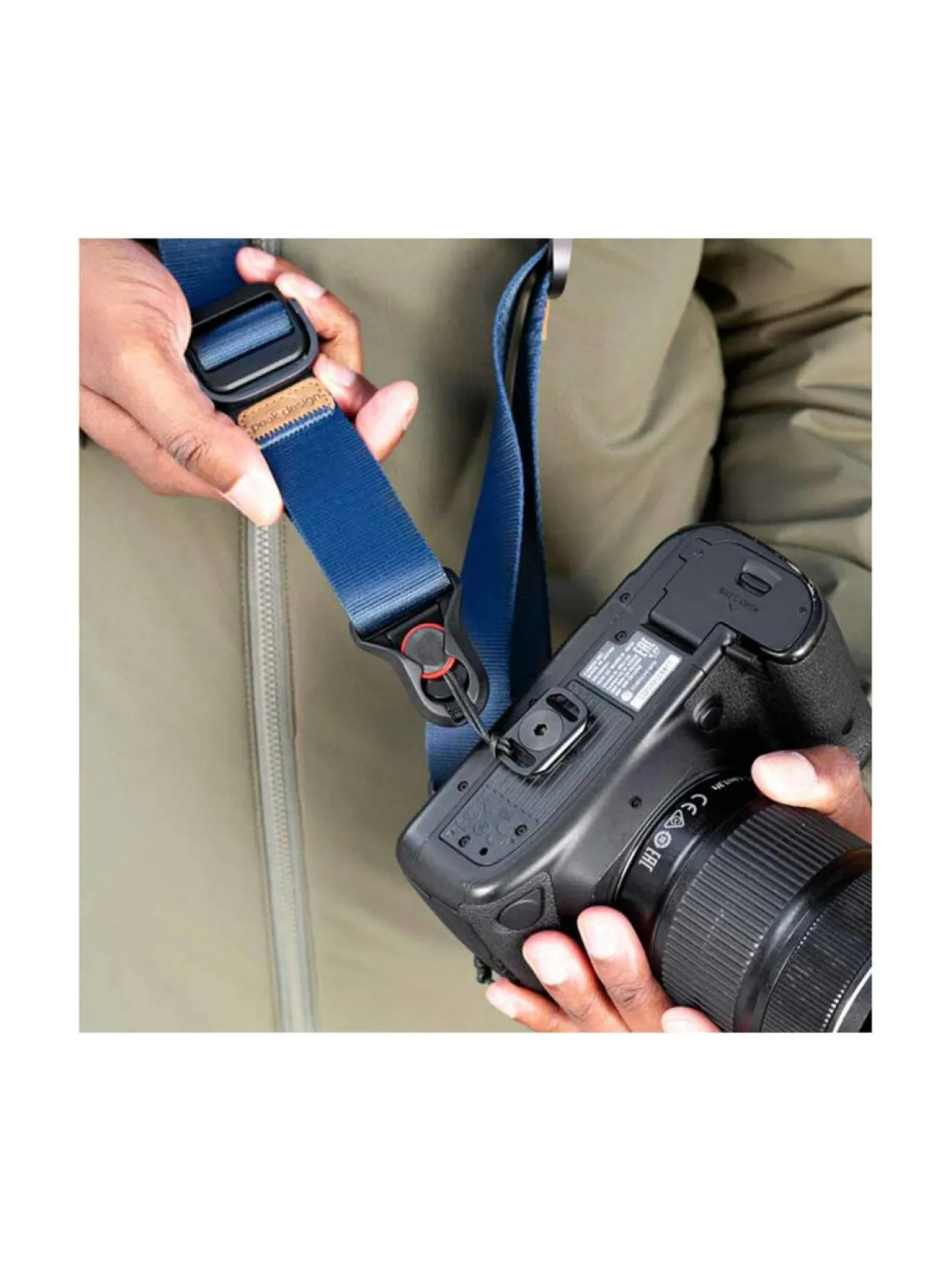 Peak Design:n SlideLITE on isoveljensä tapaan turvavyön kaltaisesta materiaalista valmistettu hihna kameralle. 32mm leveän hihnan sisäisen pehmikkeen ansiosta kamerahihnaa on mukava pitää olalla, kaulassa tai sling-tyylisesti yli olan. Slide-kamerahihnassa on alumiinista valmistetut säätimet, joiden avulla kiristät tai läysäät hihnaa. Tämä onnistuu helposti jopa yhdellä kädellä.