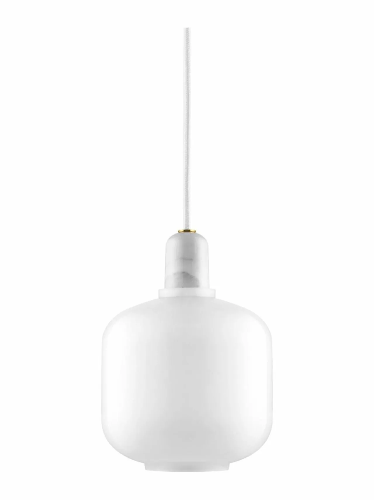 Amp on sarja lasi- ja marmorivalaisimia, jotka ovat vahvasti saaneet vaikutteita 60-luvun hi-fi-laitteista. Simon Legaldin suunnittelemien valaisimen laadukkaat materiaalit luovat mielenkiintoisen visuaalisen ilmeen, jossa herkkyys ja aisteja hivelevä raskas tuntu kohtaavat. Amp on sekä nostalginen että ajankohtainen. Valkoinen maitolasi korostaa lampun muotoilua kauniisti yhdessä valkoisten marmoriosien kanssa. Valaisimeen sopii Normann Copenhagenin 2 W:n LED-polttimo, joka myydään erikseen.