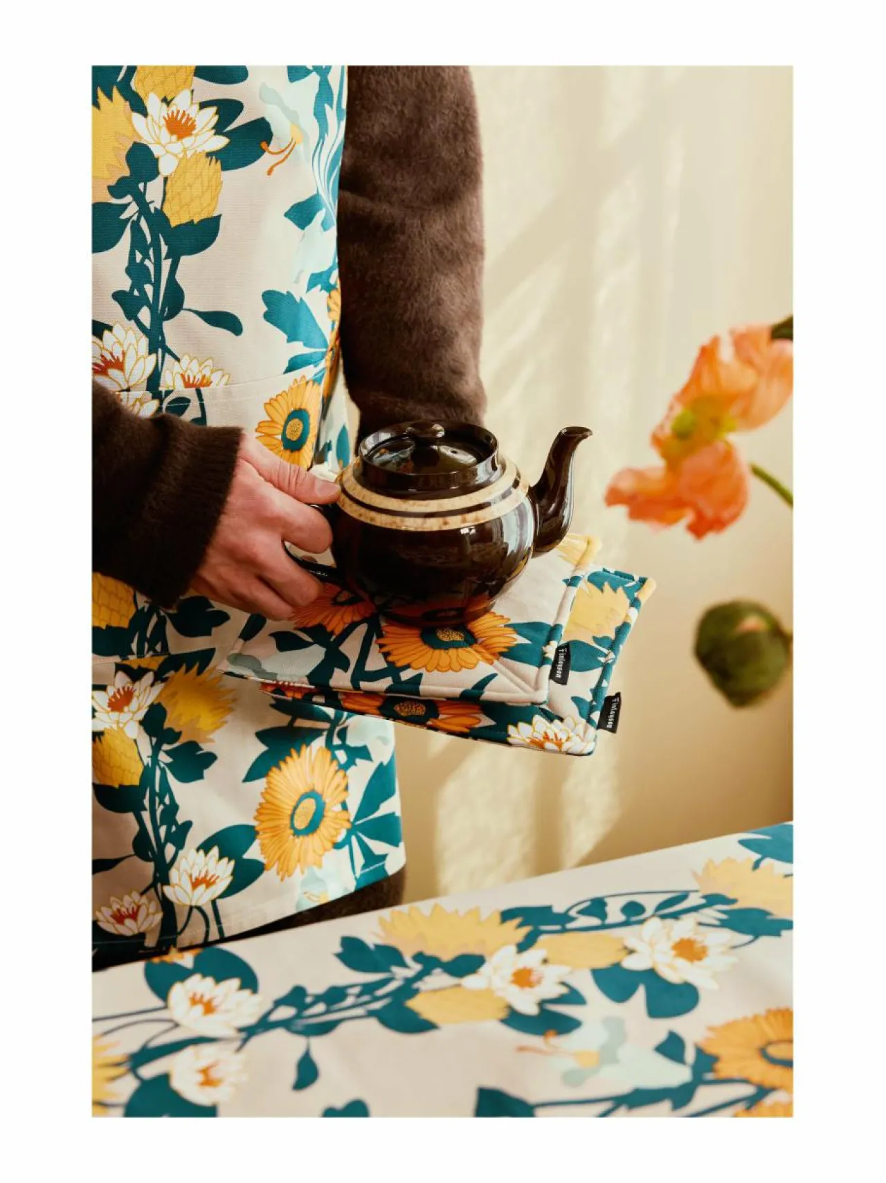 Patalappu on jokaisen kokkikolmosen luottoapuri! Kuumien vuokien ja kattiloiden käsittelyyn tarkoitettuja Kaksin-patalappuja koristaa Milja Ahosen suunnittelema kukkakuosi, jossa kaksi näennäisesti erilaista kasvia ovat löytäneet elämän mittaisen symbioosin. Patalappujen 100 % puuvillasta tehty kangas on kudottu puolipanamaksi, jossa puolet langoista on kaksinkertaisia – tämä antaa patalapuille napakan ja paksuhkon tuntuman. Ja mikä parasta: Puolet patalappujen puuvillasta on kierrätettyä. Patalapuilla on CE-merkintä, eli ne testatusti suojaavat käsiä kuumalta. Kulmasta kulmaan tikattu taittoura helpottaa astioihin tarttumista, ja ripustuslenkillä saat patalaput nätisti roikkumaan ja keittiötä koristamaan.