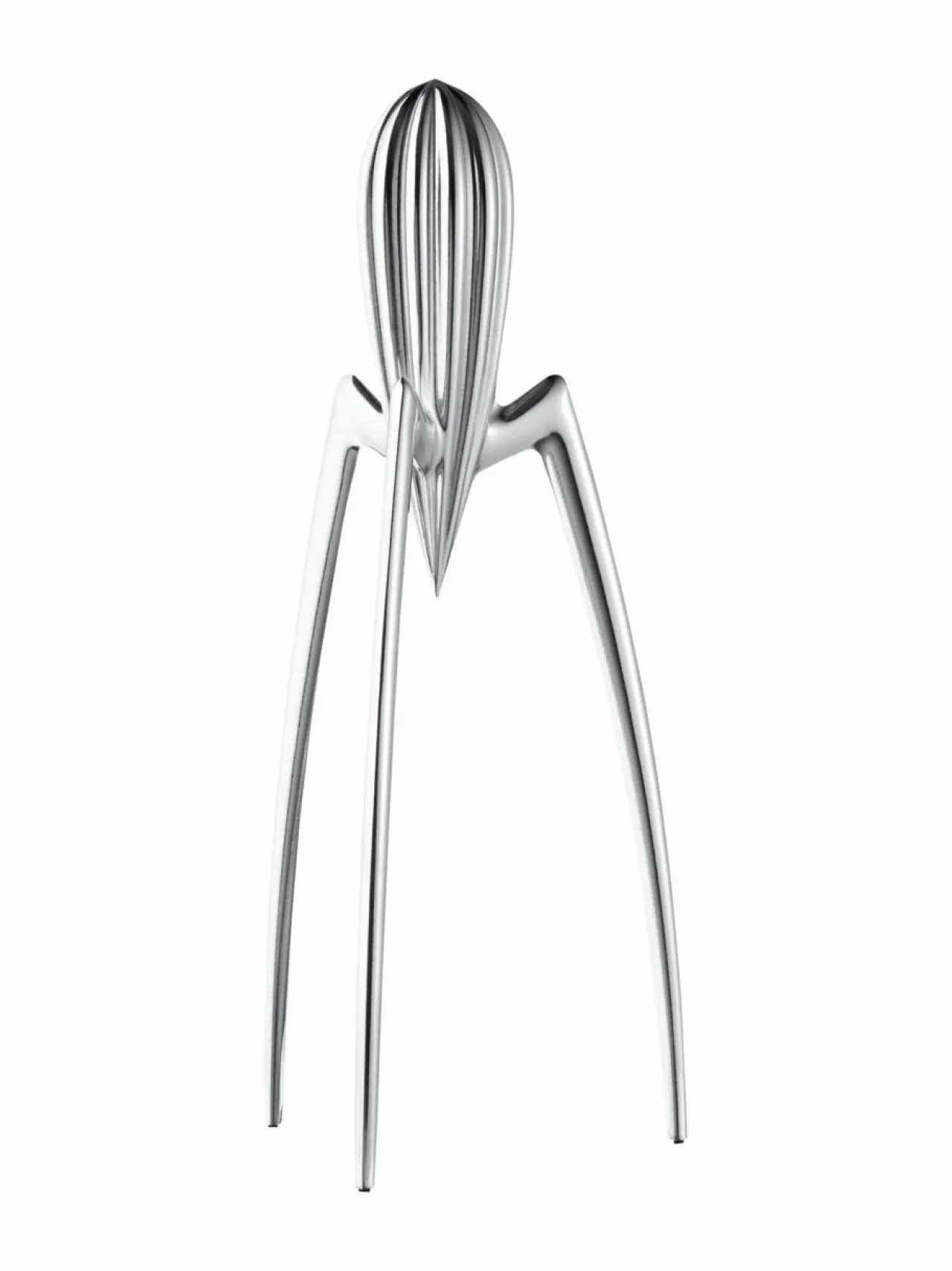 Tämä sitruspuserrin löytää tiensä kaapin kätköistä keittiön pöydälle. Kaunista käyttöesinettä ei tarvitse piilotella. Korkeus 29 cm, halkaisija 14 cm. Tämän modernin klassikon on suunnitellut Philippe Starck 1990. Materiaali on peilikiillotettua alumiinia.