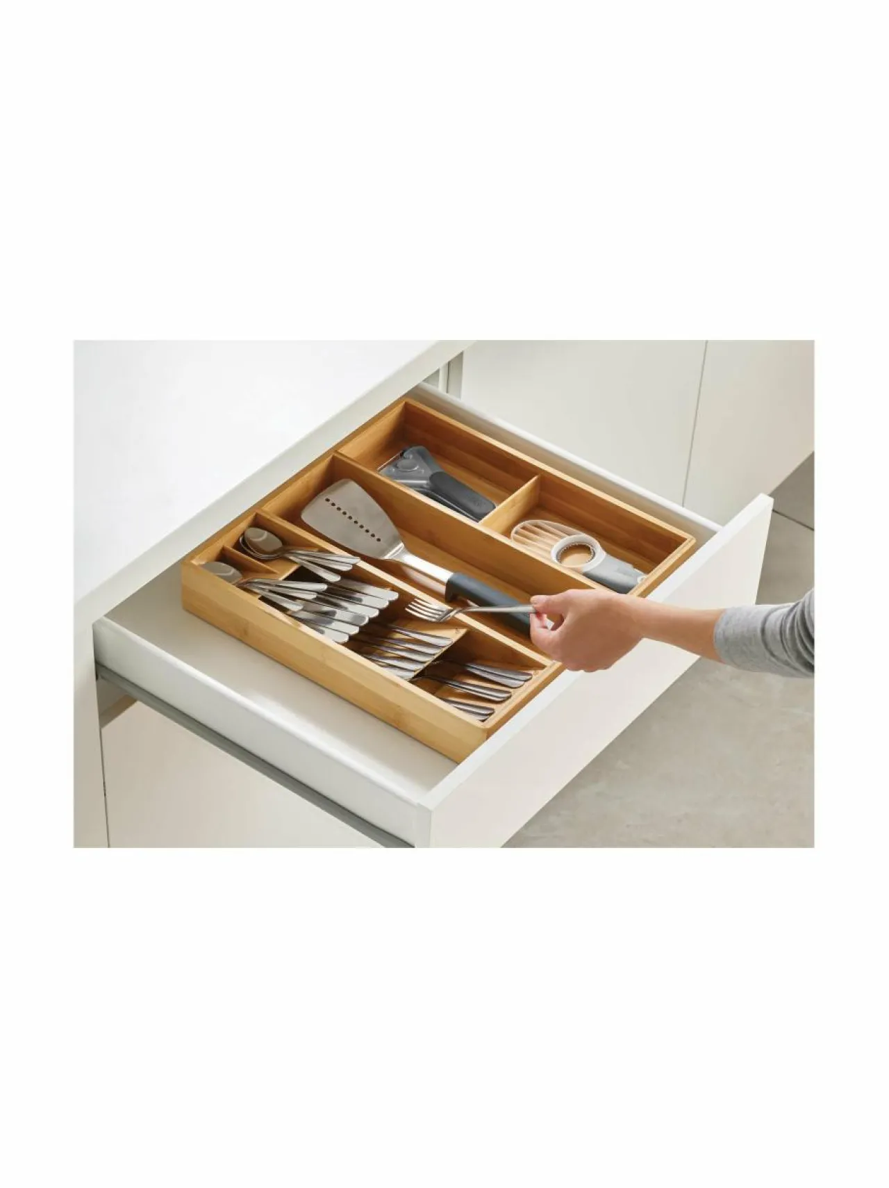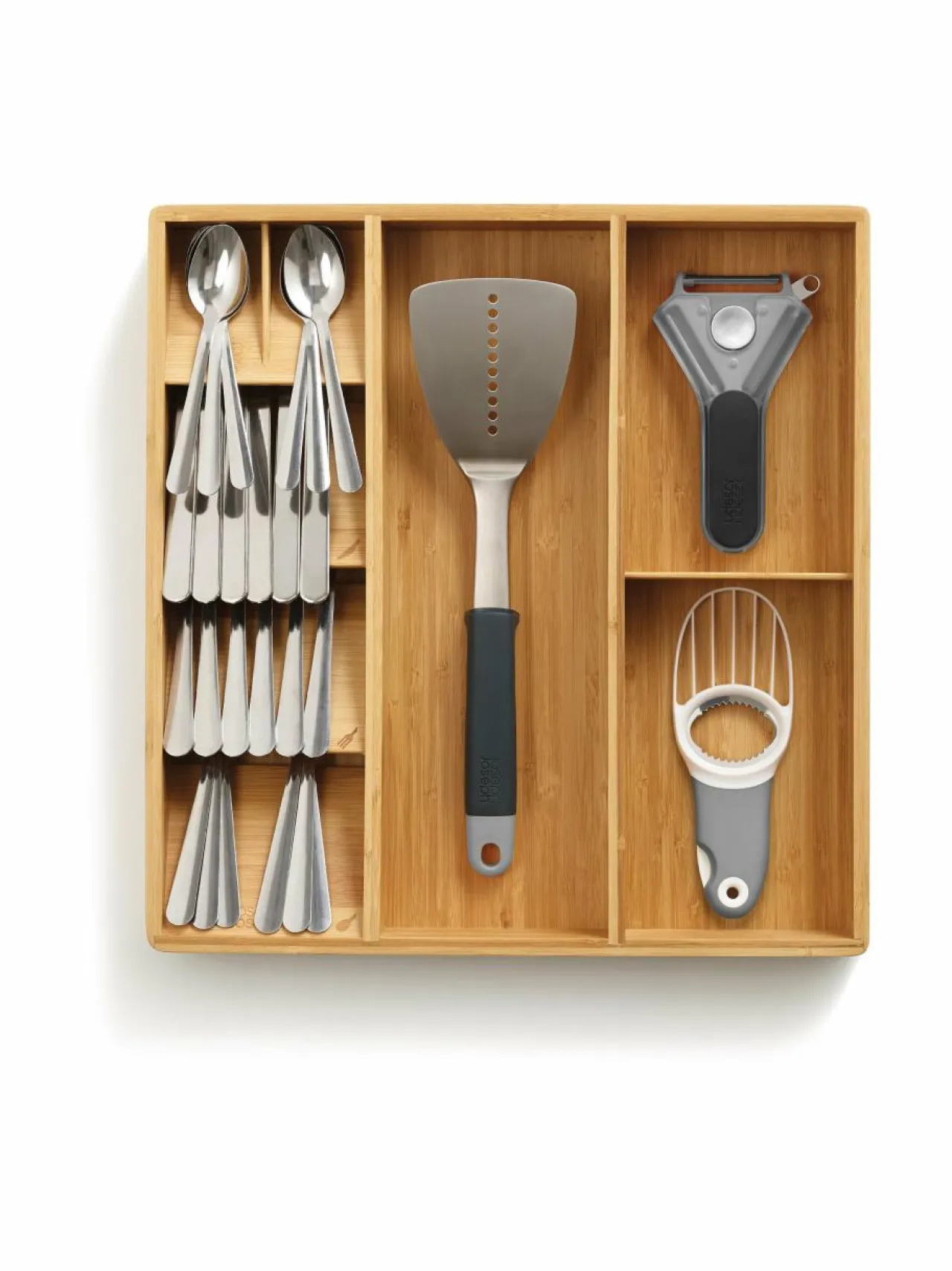 Joseph Josephin aterinlokerikko uniikilla muotoilulla on järkevä säilytysratkaisu ruokailuvälineille. Kompaktissa laatikossa aterimet pysyvät siistissä järjestyksessä tilaa säästäen. Valmistettu luonnollisesta bambusta. Teline pysyy hyvin paikallaan liukumattoman pohjan ansiosta