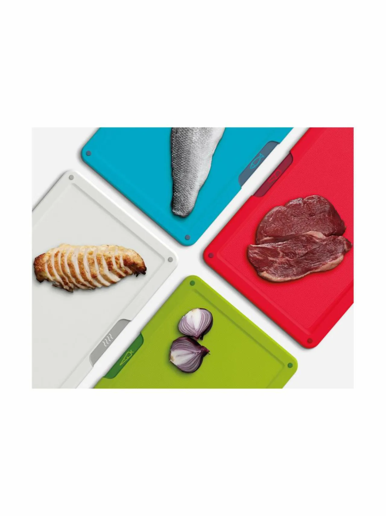 Pidä leikkuulaudat järjestyksessä ja vähennä ristikontaminaatiota valmistaessasi ruokaa näillä tyylikkäillä värikoodatuilla leikkuulaudoilla. Jokainen leikkuulauta on merkattu kuvakkeella, joka ilmaisee minkä ruokalajin sitä tulisi käyttää – raaka liha, raaka kala, vihannekset tai kypsennetty ruoka.