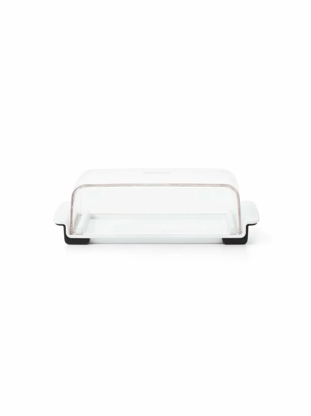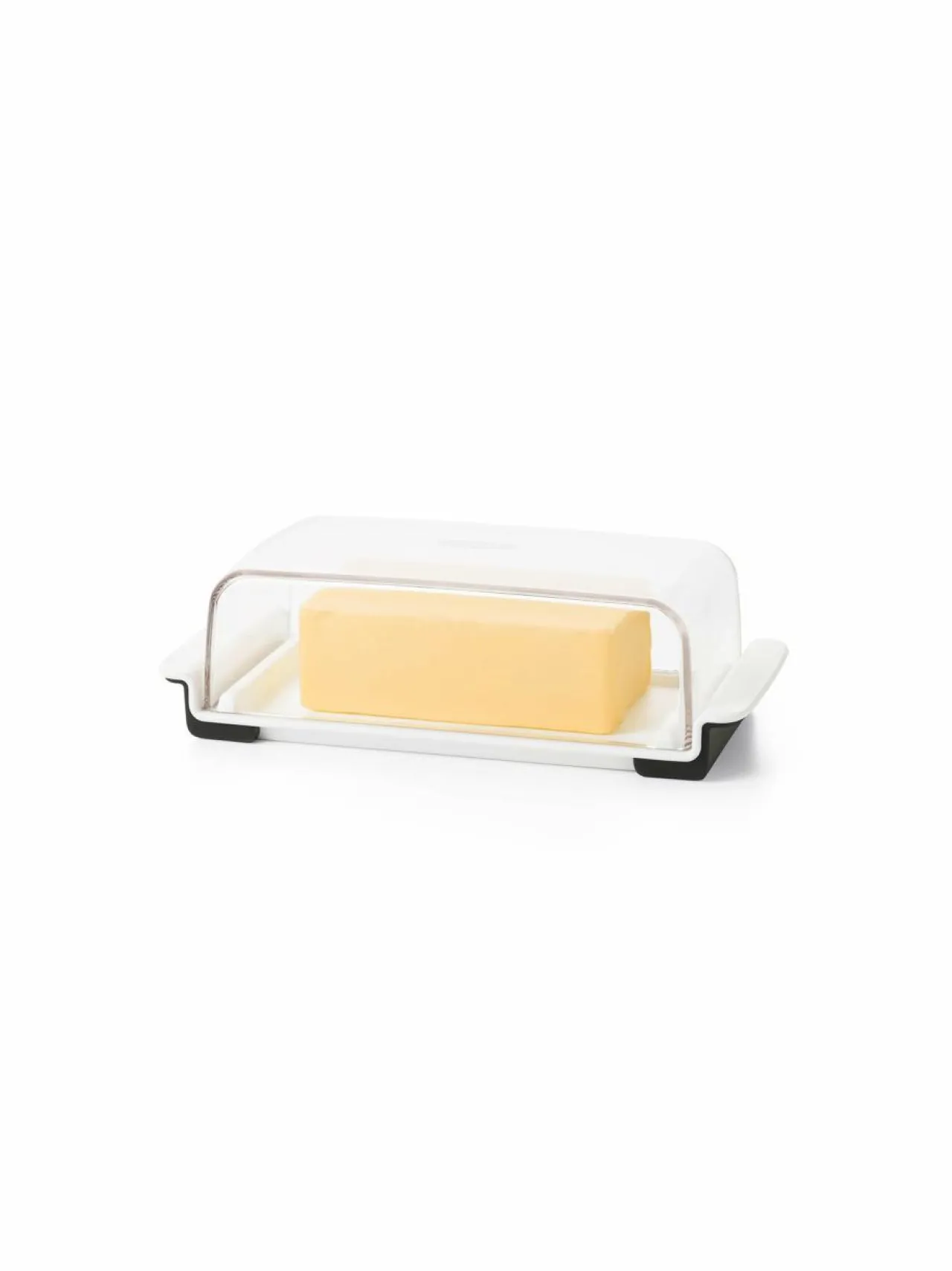 OXO Wide Butter Dish -astia sopii voille tai tuorejuustolle. Astian pohjassa on pitoa antavat jalat. Kansi pitää jääkaapin muut aromit loitolla.