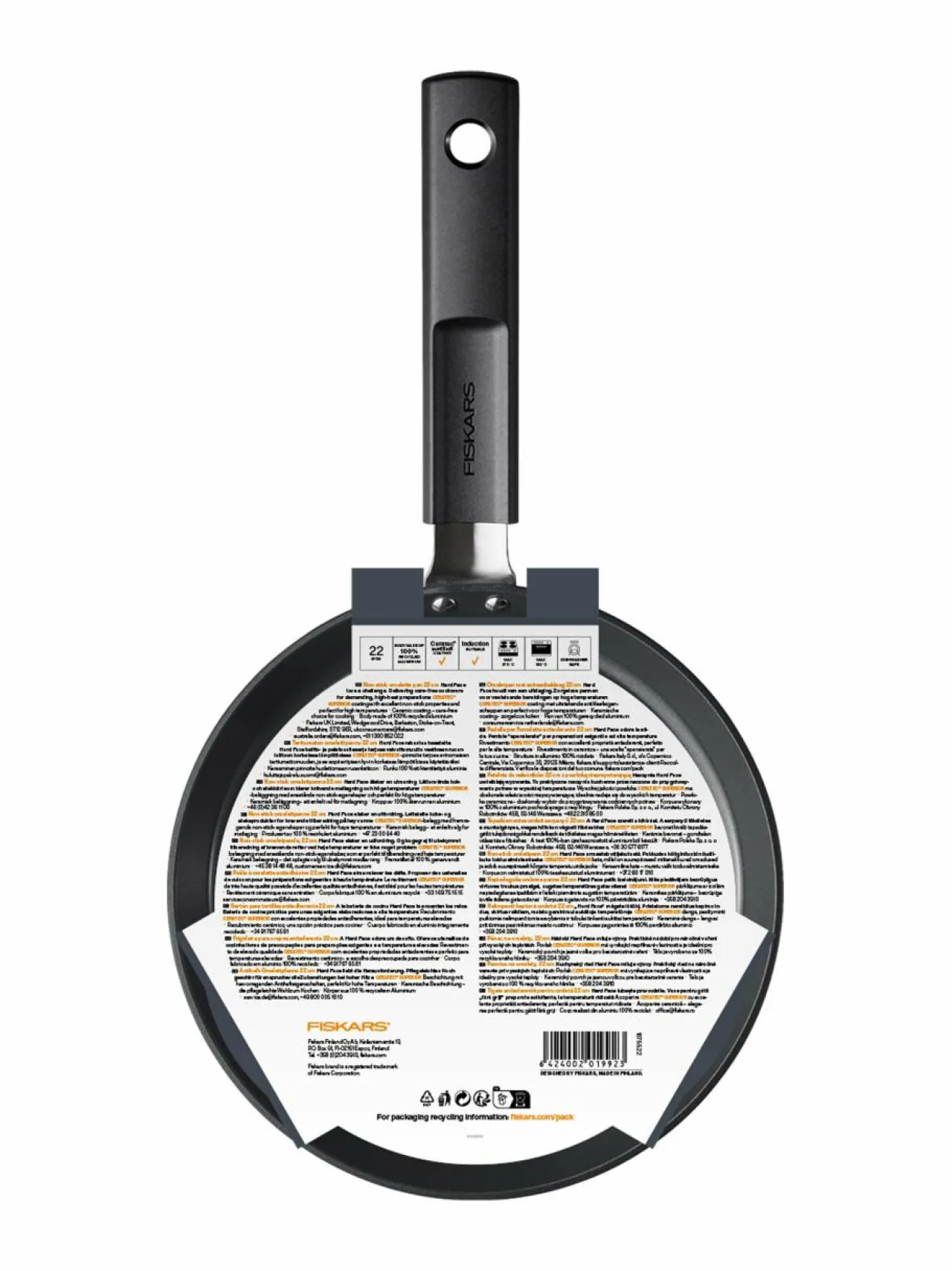 Uudistunut Fiskarsin Hard Face -sarja on suunniteltu vaativampaankin arjen ruoanlaittoon. Tämä 22 cm leveä paistinpannu on modernin muotoilun mestariteos. Paistinpannun paksu alumiinirunko kuumenee tehokkaasti ja tasaisesti, ja siksi se on täydellinen vaihtoehto esimerkiksi munien tai pannukakkujen paistamiseen matalien reunojensa ansiosta. Uusi tarttumaton Ceratec Superior™ keraaminen pinnoite on muoviton. Kahva takaa hyvän otteen ja pysyy ihanan viileänä. Paistinpannussa on pinnoitettu ja innovatiivinen energiapohja, joka tekee kokkaamisesta 50 % nopeampaa ja säästää energiaa keraamisilla liesillä jopa 30 %. Toimii kaikenlaisilla liesillä ja on konepesun kestävä. Uuninkestävä aina 150 asteeseen saakka ja kestää maksimissaan 240 asteen paistolämpötilan.