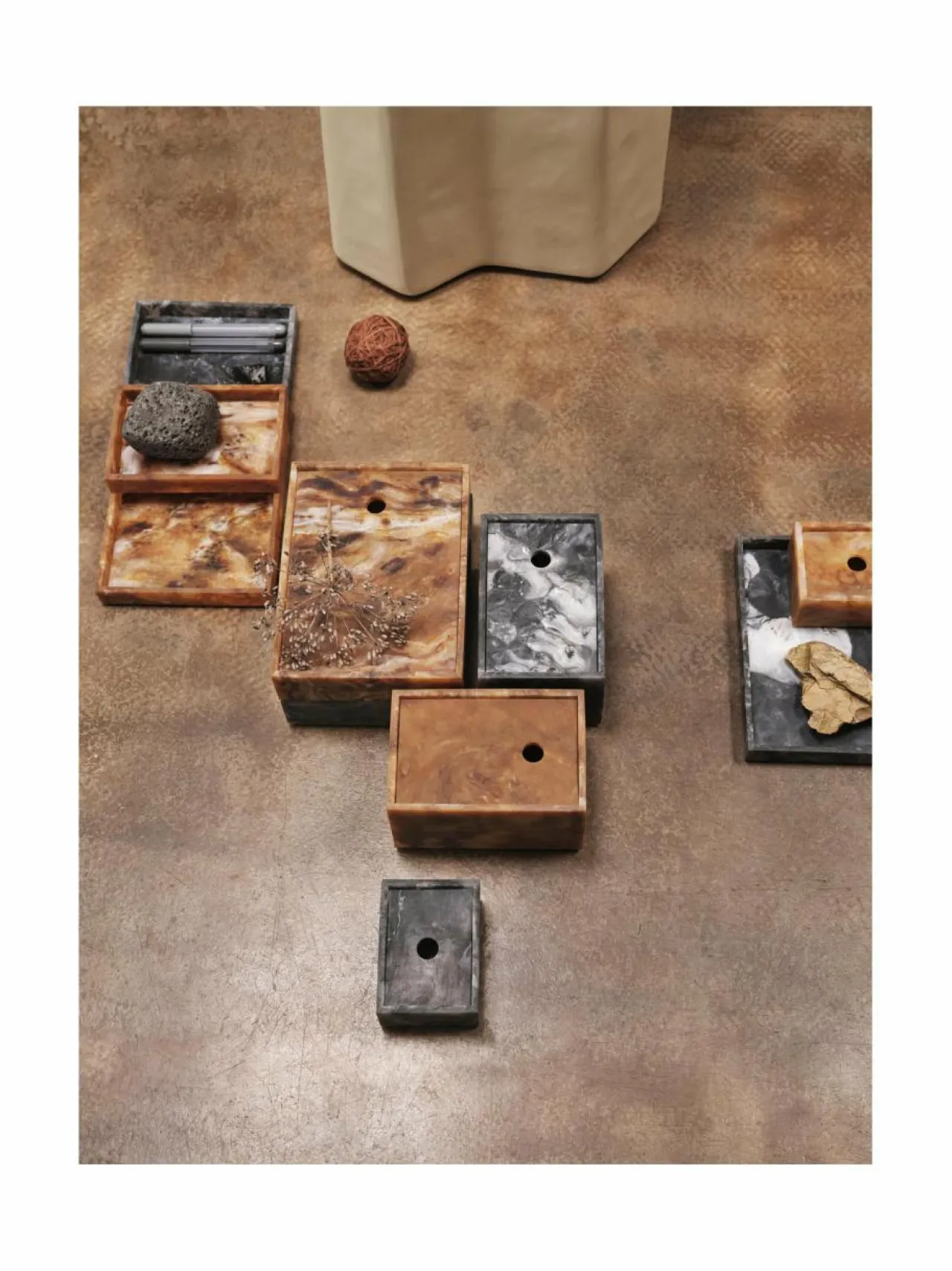 Ferm Livingin Mist-säilytyslaatikko on elegantti kannellinen säilytysrasia, jossa yhdistyy käytännöllisyys ja geometrinen muotokieli. Säilytysrasian kannessa on pieni pyöreä aukko, josta irrallisen kannen voi helposti nostaa. Rasia on valmistettu 100 % valuhartsista.