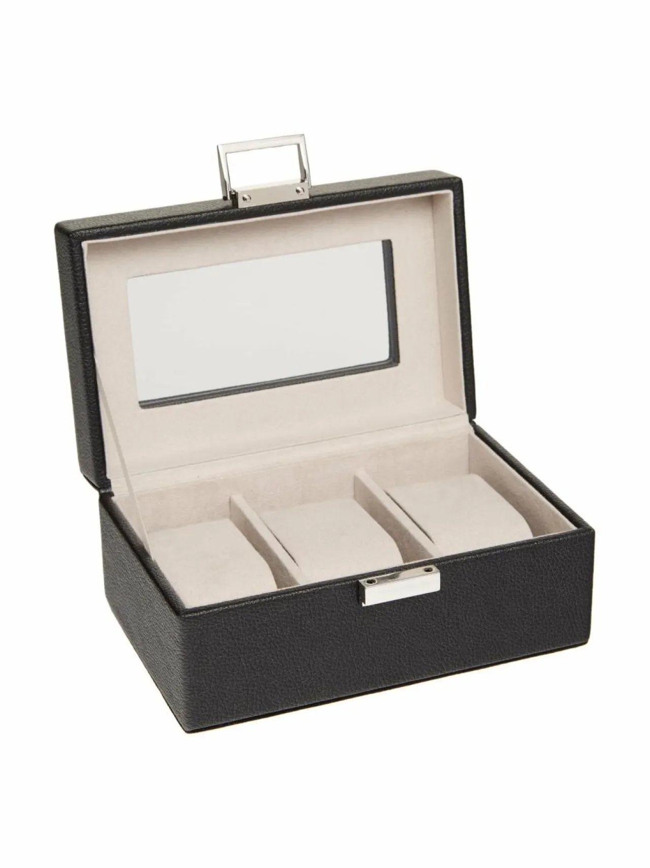 Kätevä pienikokoinen kellorasio, jossa pehmeä pehmustettu tekonahkainen ulkopinta, kevyt samettinen sisäpuoli ja läpinäkyvä kansi kokoelman katselemiseksi laatikon ollessa suljettuna. Rasiassa on tilaa kolmelle kellolle.