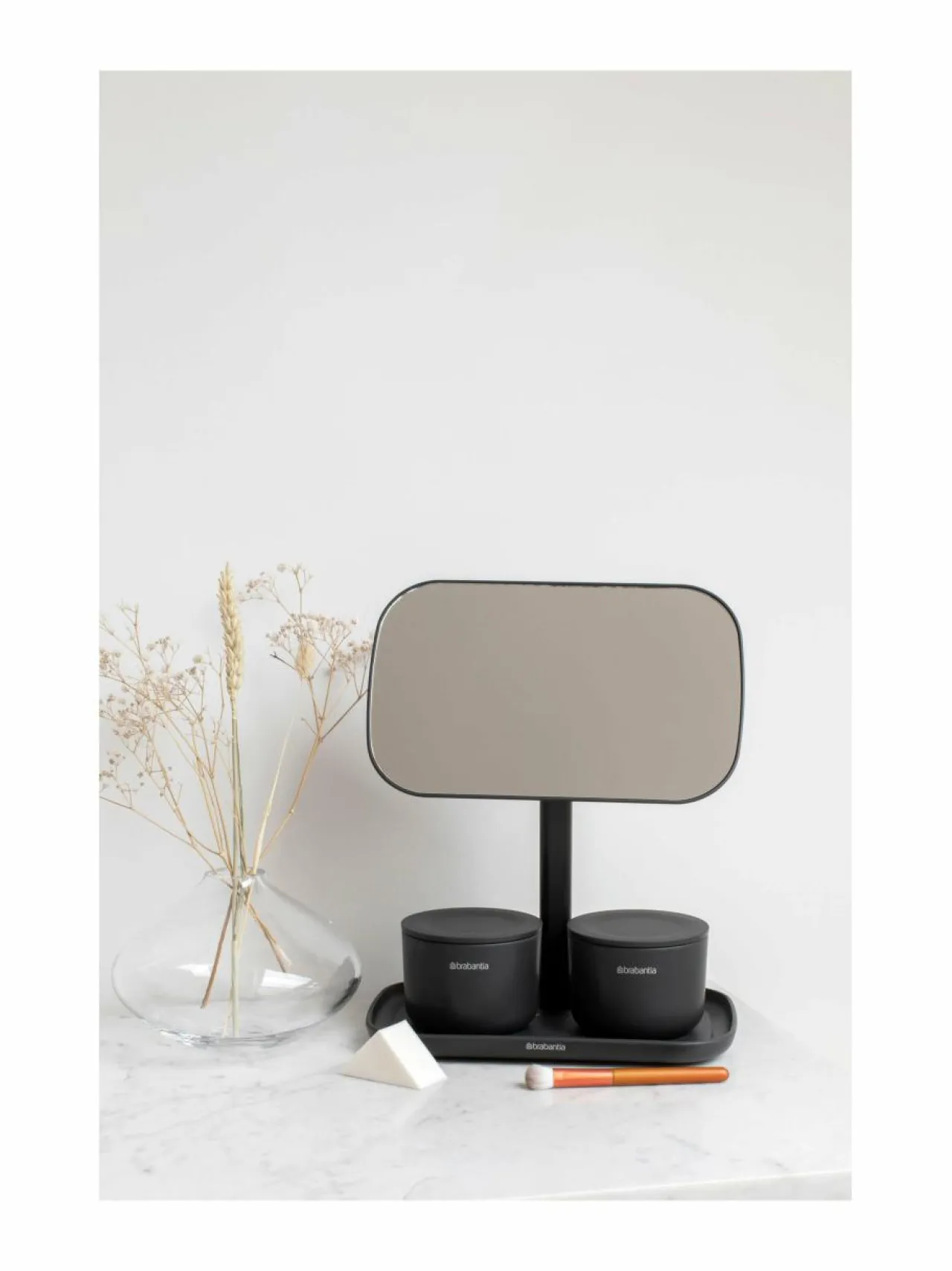 Brabantia ReNew -peili on minimalistinen pöytäpeili, jonka jalustassa on käytännöllinen tarjotin. Peiliä voi kääntää aina sopivaan asentoon helposti, sekä korkeudeltaan että sivuille. Jalustassa on pieni tarjotin, jossa silikoninen alusta. Myös pohjassa liukueste. 5 vuoden takuu.