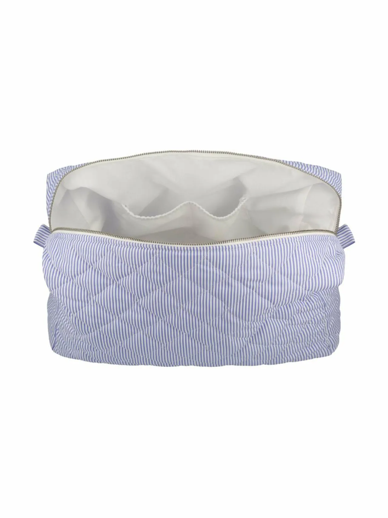 Käytännöllinen ja suloinen kosmetiikkalaukku, jossa on sisätaskut, ja jota tyylittää raikas raitakuosi. Puuvillainen laukku on viimeistelty pehmeällä tyylikkäällä tikkauksella, joka suojaa sisältöä.