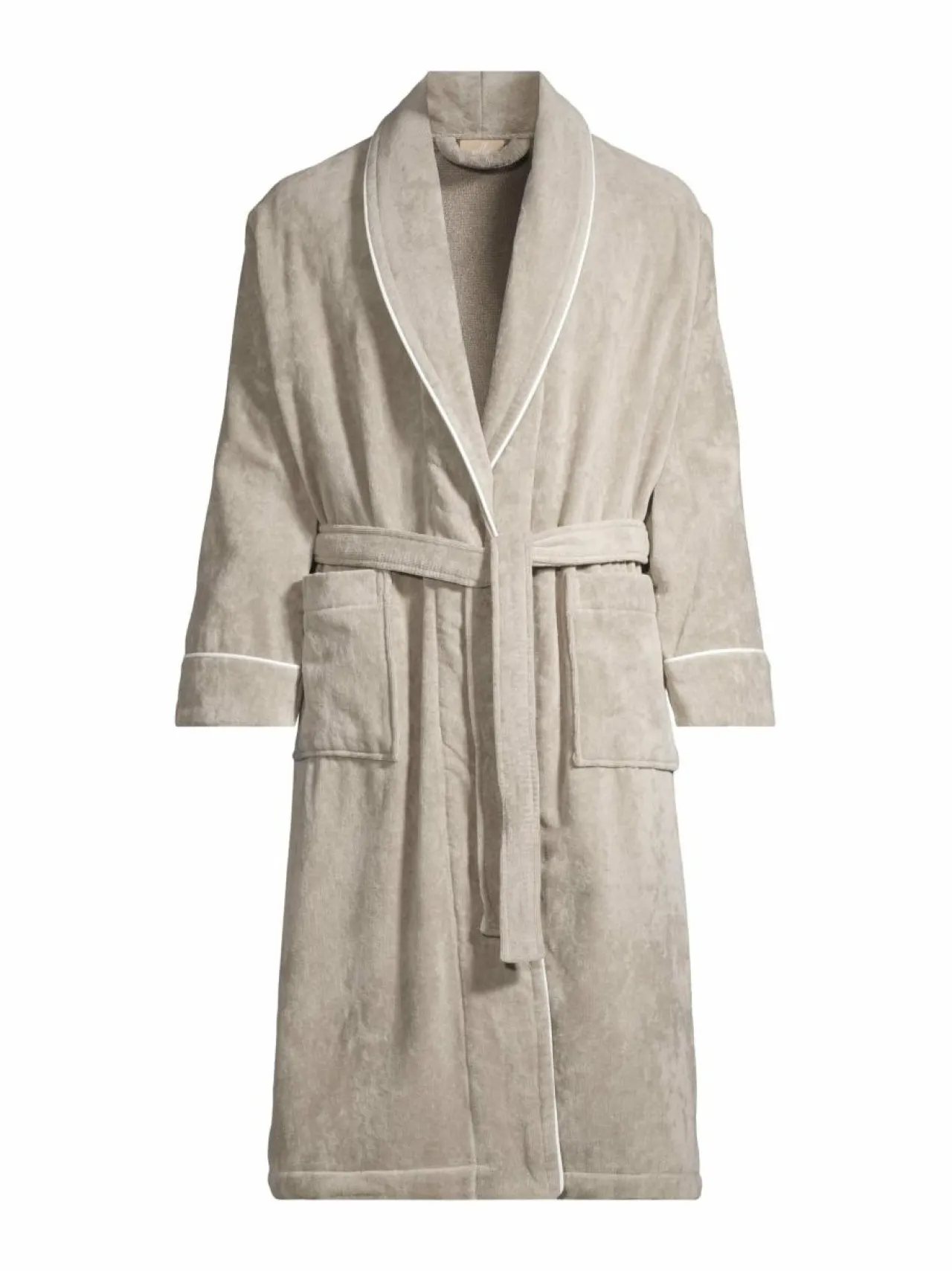 Villa Stockmannin Lounge-kylpytakki on imukykyistä puuvillavelouria, jonka lankaluku on 450. Eleganttia takkia koristavat kontrastiset poimut. Mallissa on kaksi paikkataskua ja sidottava vyö.