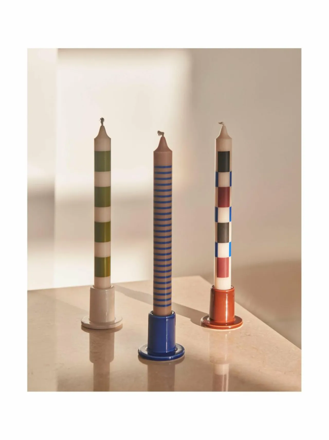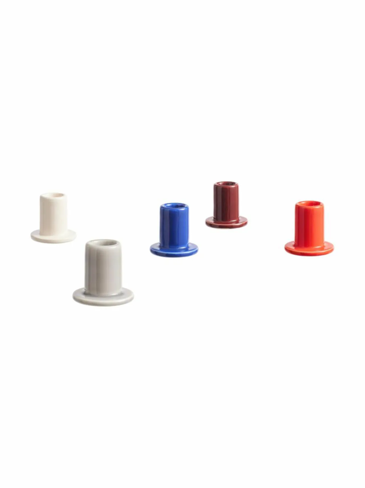Minimalistinen Tube-kynttilänjalka on valmistettu keramiikasta ja siinä on puoliksi läpinäkyvä lasitus. HAY-kynttilöiden kanssa käytettäväksi suunnitellussa kynttilänjalassa on pyöreä pohja, joka tasapainottaa muotoilua ja vangitsee tippuvan vahan.