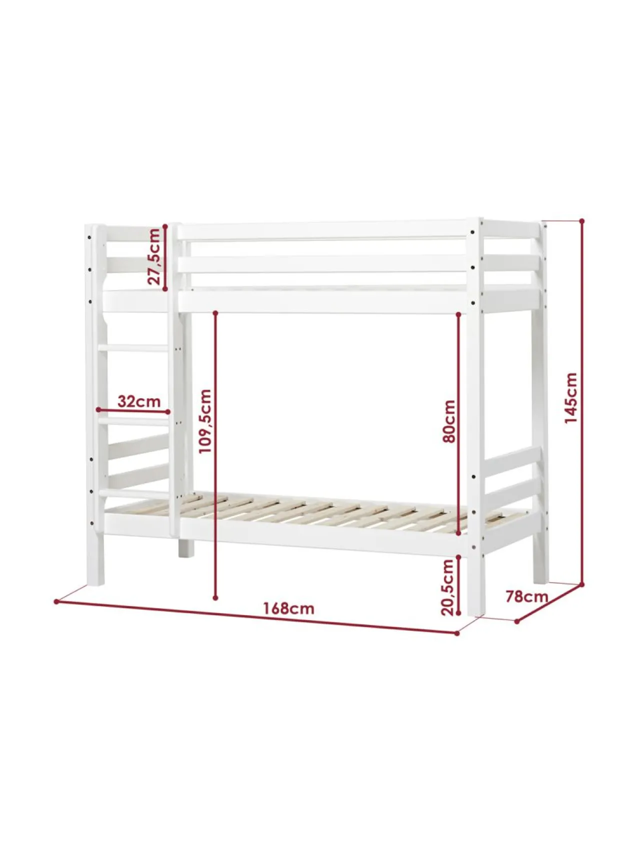 Korkeus lattiasta ylempään sänkyyn: 108 cm.