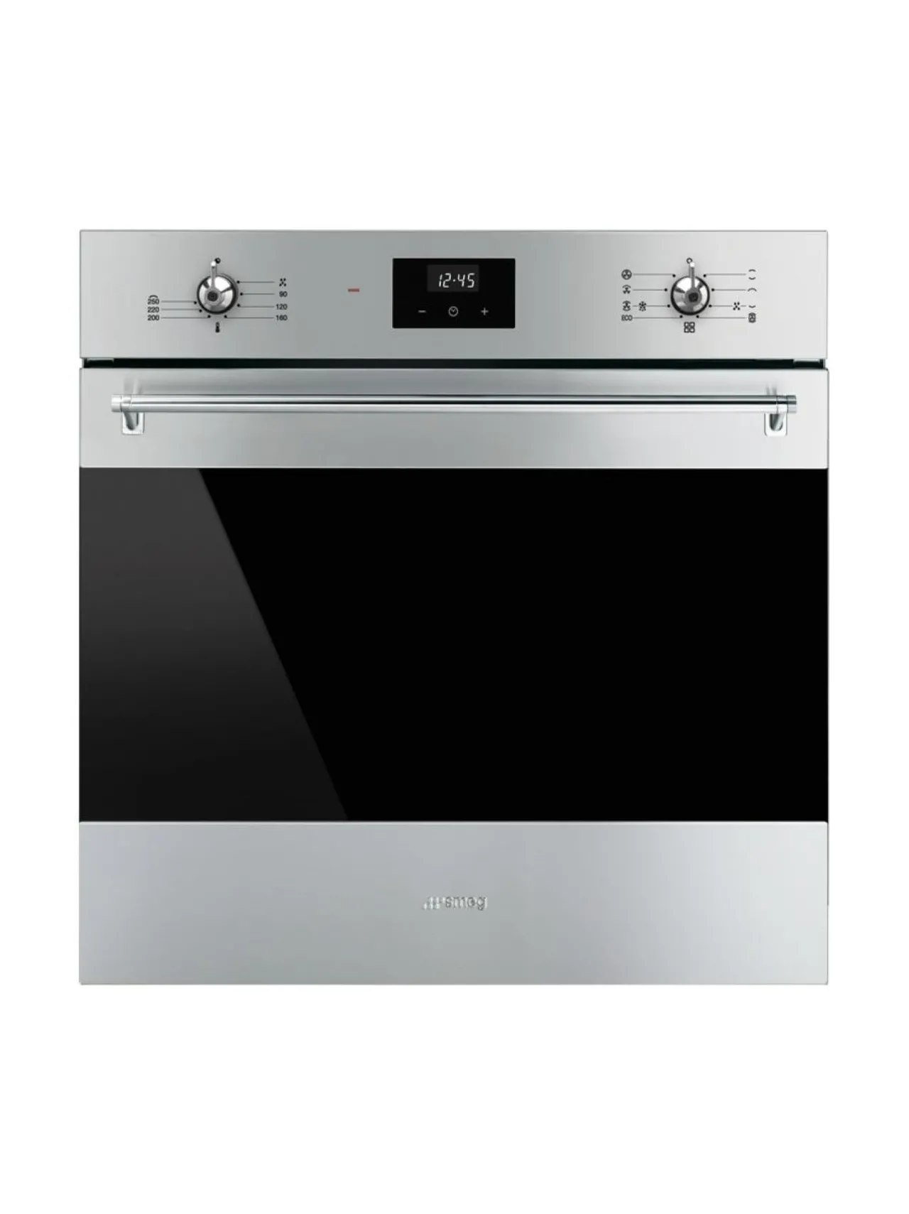 Smeg Classic-sarjan tyylikäs rosterinen kiertoilmauuni on kaapiston sisään integroitava. Etupaneeli ja ovi ovat ruostumatonta terästä sormenjälkiä hylkivällä pinnoitteella. Oven viimeistelee tyylikäs ja tukeva Classic-sarjan kahva sekä Smeg-logo. Kaunis selkeälinjainen uuni antaa modernin ilmeen keittiölle samalla kun sen useat erilaiset toiminnot nostavat ruoanlaiton aivan uudelle tasolle.