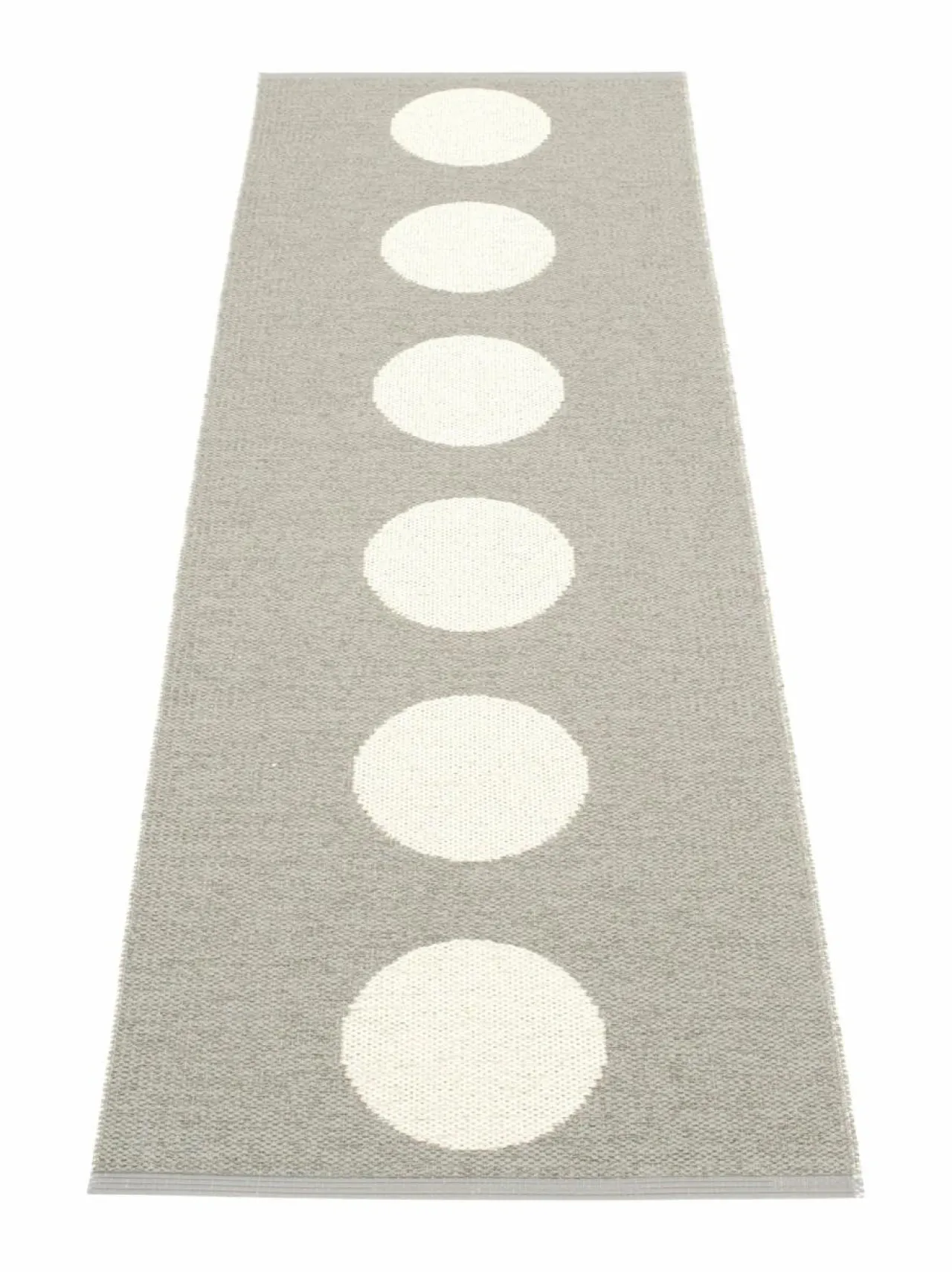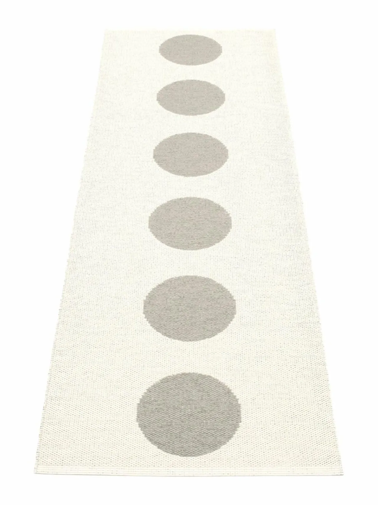 Ruotsin Taalainmaalla käsityönä valmistetut Pappelina-muovimatot ilahduttavat raikkaan skandinaavisella ilmeellään ja käytännöllisyydellään. Polyesteriloimesta ja ftalaatittomasta muovista valmistetut matot sopivat kodin kaikkiin tiloihin ja puhdistuvat helposti käsin tai koneessa. Selkeäkuvioinen Vera-matto kuuluu Pappelinan suosituimpiin malleihin vuodesta toiseen, ja siitä on kovaa vauhtia tulossa skandinaavisen muotoilun moderni klassikko. Käytännöllisestä muovimatosta on saatavilla useita eri värejä ja kokoja, joista löytyy helposti sopiva matto niin kylpyhuoneeseen, eteiseen, keittiöön kuin lastenhuoneeseenkin. Käännettävän maton toisella puolella on sama kuvio vastakkaisin sävyin.