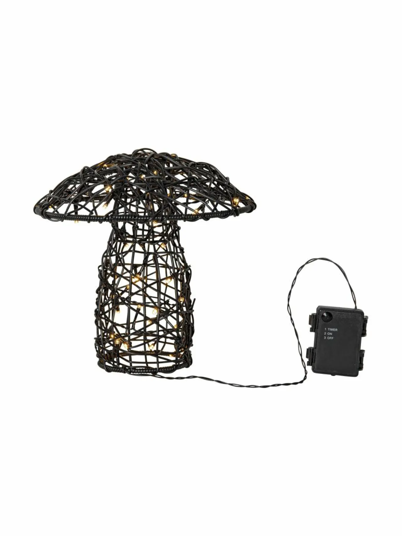 Paristokäyttöinen ulkokäyttöön sopiva sienen muotoinen valokoriste, joka on valmistettu metallista ja polyrottingista. Koristesientä valaisee 50 lämpimän valkoista LED-valoa. Sopii esimerkiksi terassille tai puutarhaan tuomaan tunnelmallista valoa. Ajastintoiminnon avulla valot palavat 6 tunnin ajan kerrallaan ja syttyvät seuraavana päivänä samaan aikaan uudelleen. Toimii kolmella AA-paristolla, jotka eivät sisälly pakkaukseen. Lamppujen väli 7 cm. Halkaisija 27 cm ja korkeus 26 cm. Kiinteä LED, lamppuja ei voi vaihtaa.
