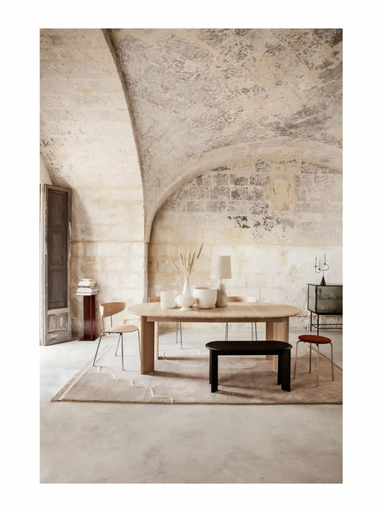 ferm LIVING Bevel Table Extendable -pöytä on valmistettu öljytystä massiivitammesta. Leveät jalat tuovat modernin vivahteen klassiseen ilmeeseen. Sekä pöytälevyn että jalkojen pyöristetyt reunat pehmentävät kokonaisuutta. Pöydän korkeus on 73 cm ja kahdella jatkopalalla muunneltava pituus 117-217 cm. Viides jalka varmistaa rakenteen tukevuuden, kun molemmat jatkopalat ovat käytössä.