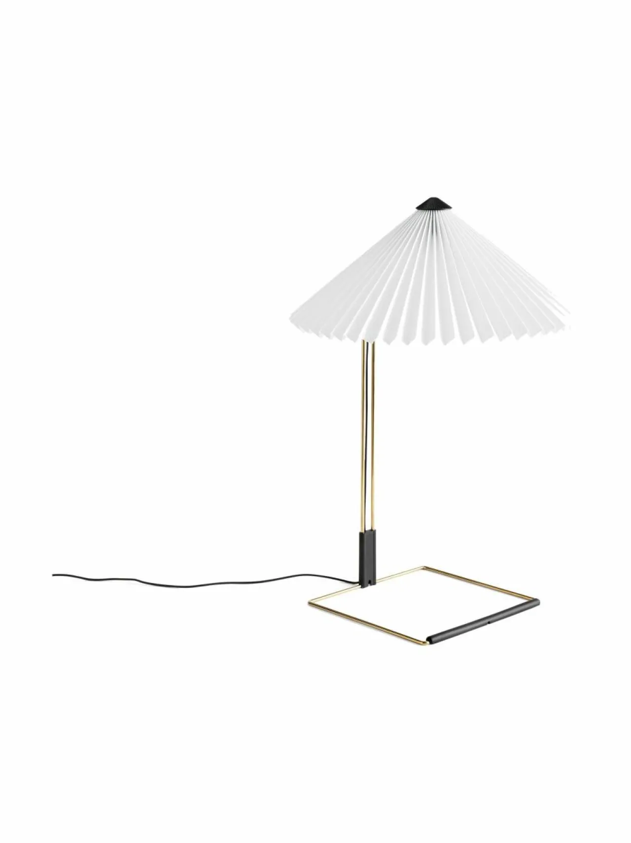 Hay Matin -pöytavalaisimessa on modernia, poeettista muotokieltä, jossa visuaalinen herkkyys yhdistyy fyysiseen jykevyyteen. Lamppu muotoutuu teräslangasta taivutetusta rungosta, joka on viimeistelty kiiltävällä messingillä ja mattamustilla yksityskohdilla. Runkoon on yhdistetty pliseeratusta puuvillakankaasta valmistettu lampunvarjostin. Valonlähteenä toimii kiinteä LED-lamppu, joka tarjoaa pehmeää, alaspäin suuntautuvaa valoa. Himmentimen avulla säädät valon määrää.