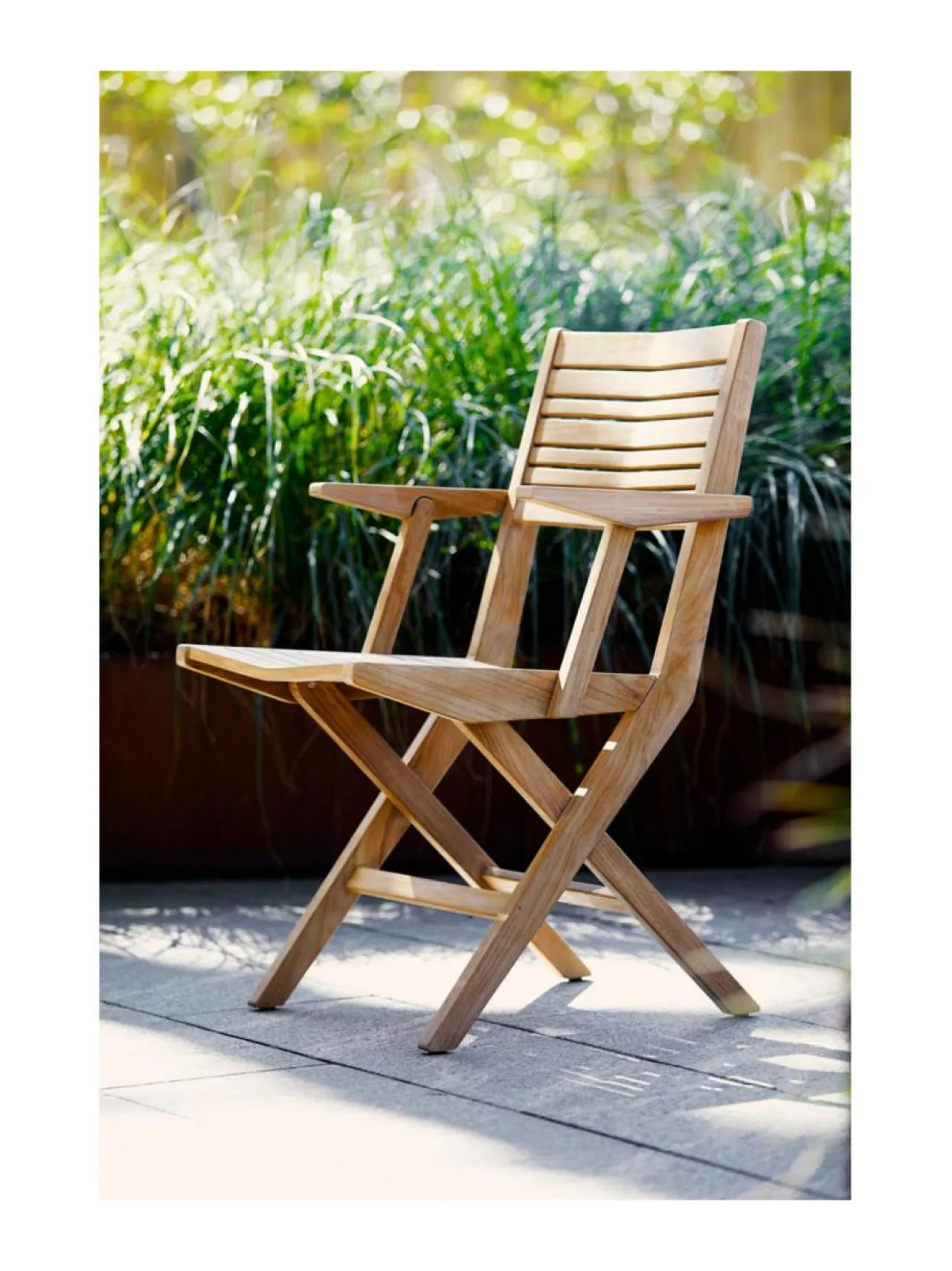 Käytännöllinen Flip-taittotuoli käsinojilla ulkokäyttöön. 56 cm lev x 58 cm syv x 86 cm kork, 47 cm istuinkork. Tyylikästä ja kestävää tiikkiä.