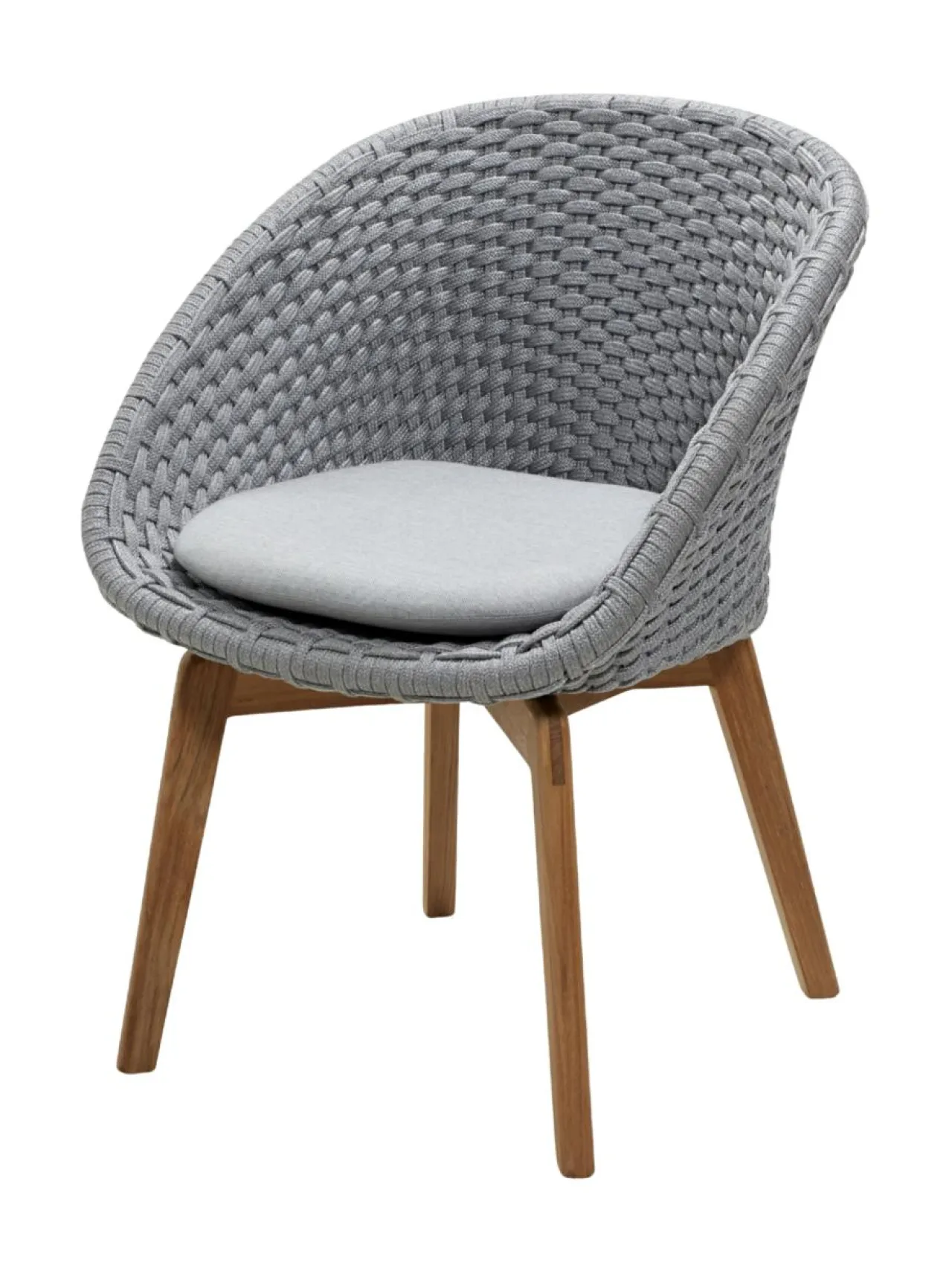 Peacock-tuoli ulkokäyttöön. 61 cm lev, 61 syv, 81 kork, 47 istuinkork. Istuintyyny sisältyyhintaan, vaalean harmaa Cane-line Natté. Teak runko, vaalean harmaa Cane-line Soft Rope -punos.