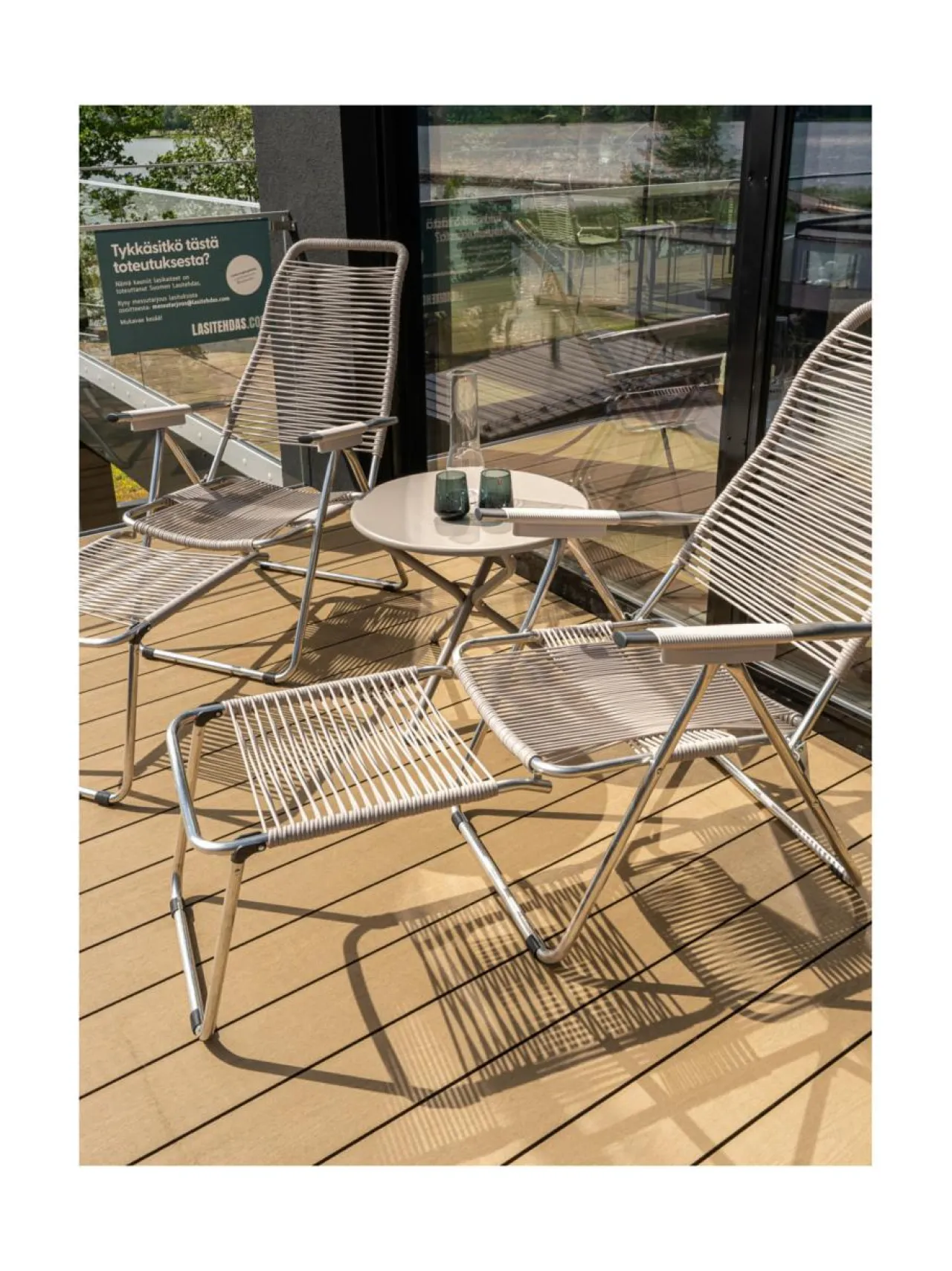 Maksimipaino 110 kg.Tuotenumero1510600 MateriaaliRunko alumiinia, kestävä pvc-punos Hoito-ohjeetTuotteen puhdistus kostealla liinalla. Älä käytä hankaavia puhdistusaineita tai vahvoja puhdistusaineita. PesuohjeetKäsinpesu Takuu24 kk VäriBEIGE AvainsanatFiam, Spaghetti, aurinkotuoli
