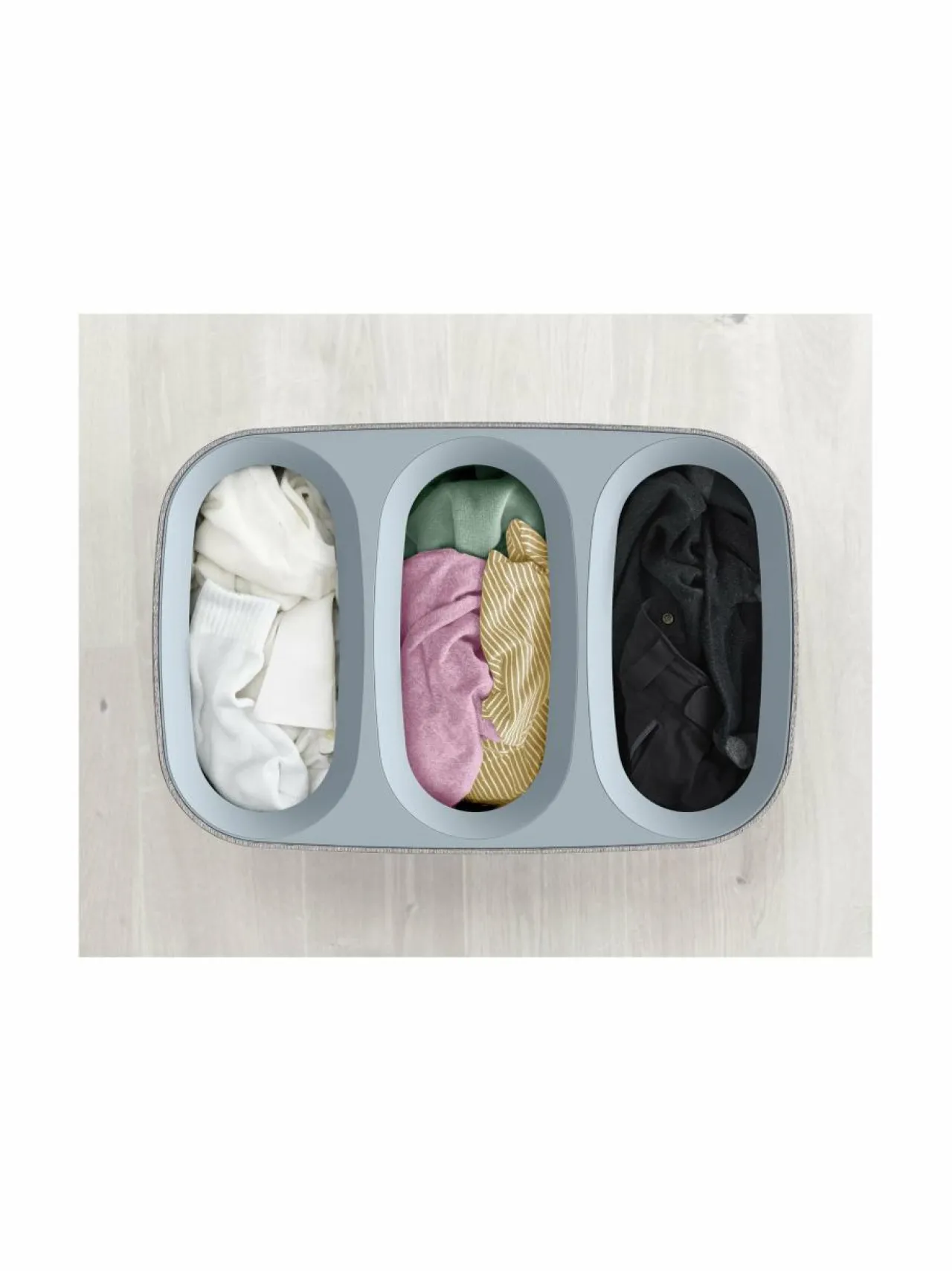 - Kannen alla 3 x 30 litran tekstiilistä tote-kassia, joihin voi lajitella pyykit