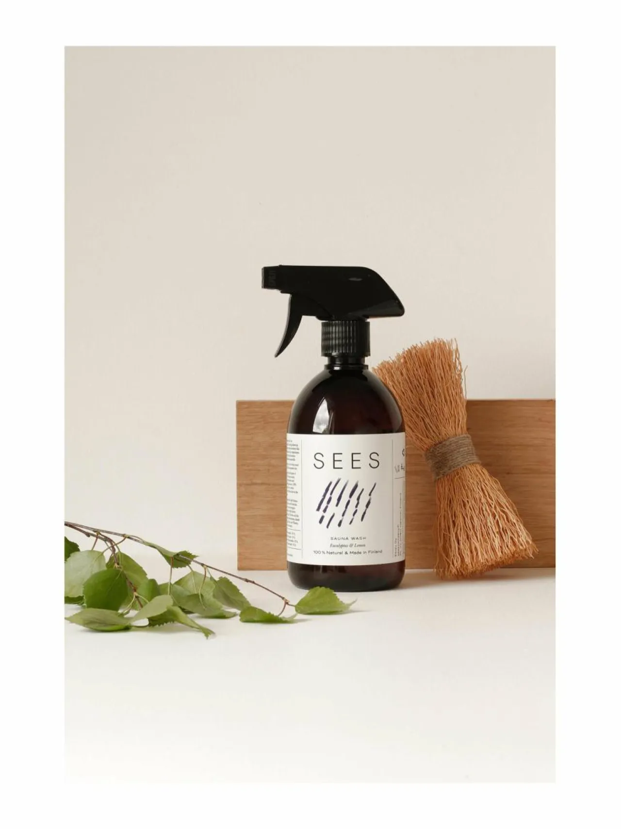 Biohajoava Sees Saunapesu on helppo tapa pestä koti- tai mökkisauna – ja samalla suihkuhuoneen kaakelit ja lasiovet. Spray-pullo tekee pesemisestä nopeampaa ja vaivatonta, eikä voimakasta jynssäämistä tarvita. Suomalaisena saunominen on lähellä sydäntä ja viihtyisän saunanillan saa aikaan puhdas ja raikkaan tuoksuinen sauna.Sooda-pohjainen saunapesu on tehokas pinttyneen lian ja hajujen poistaja. Eucalyptuksen ja sitruunan eteerisillä öljyillä tuoksutettu saunapesu on valmistettu korkealaatuisista kasviperäisistä raaka-aineista. Tuoksussa yhdistyy raikkaan sitruunan ja virkistävän eucalyptuksen eteeriset öljyt, jotka yhdessä piristävät ja raikastavat tehokkaasti koko saunan sekä tunkkaisen huoneilman. Pesun yhteydessä eteeristen öljyjen arvokkaat tuoksut vaeltavat ympäriinsä ja voit nauttia niiden aikaansaamasta aromaterapiasta.Saunapesu ei ainoastaan piristä pelkkää saunaa, vaan myös pesijän mielen. Suomessa valmistettu saunanpesuaine kuormittaa vähemmän luontoa ja on 100 % luontoon biohajoava. Pesuaineessa ei ole käytetty keinotekoisia ainesosia tai tuoksuaineita.Saunapesuaineella peset kätevästi lauteet, penkit, seinät, lattiat, suihkutilat ja jopa saunan vadit — erinomainen valinta suomalaiseen saunaan.