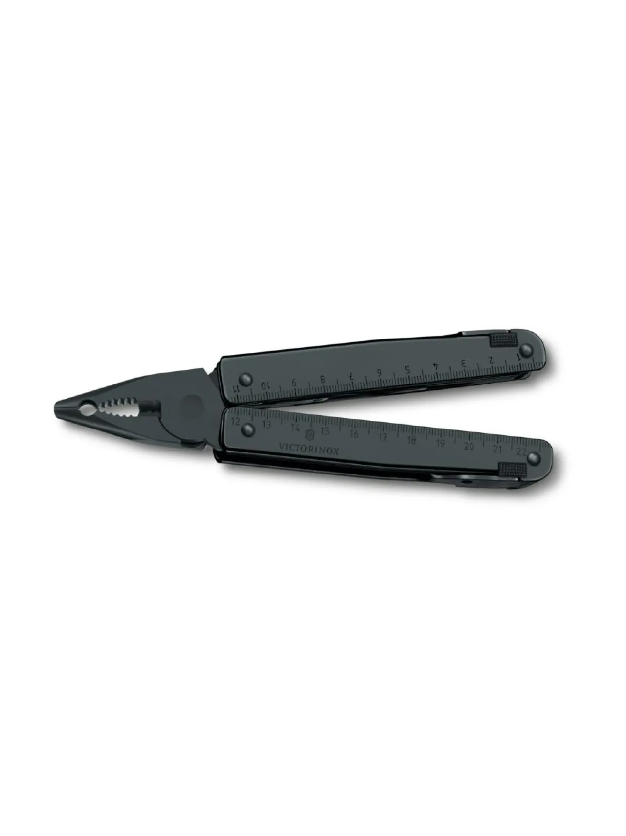 Järeä monitoimityökalu ammattimaiseen käyttöön. SwissToolin kaikki terät ovat lukittuvia ja siksi sen käyttö on turvallista. Kaikki terät aukeavat suoraan sivuilta ilman että pihtejä tarvitsee avata. Työkalun musta viimeistely suojaa korroosiolta. Musta suojakerros valmistetaan emäksisellä käsittelyllä, jota kutsutaan oksidoinniksi. Suojaava kerros on vaaraton ihmisille ja eläimille (EC 1935/20049) ja se voidaan puhdistaa käyttöoppaassa olevien ohjeiden mukaisesti.