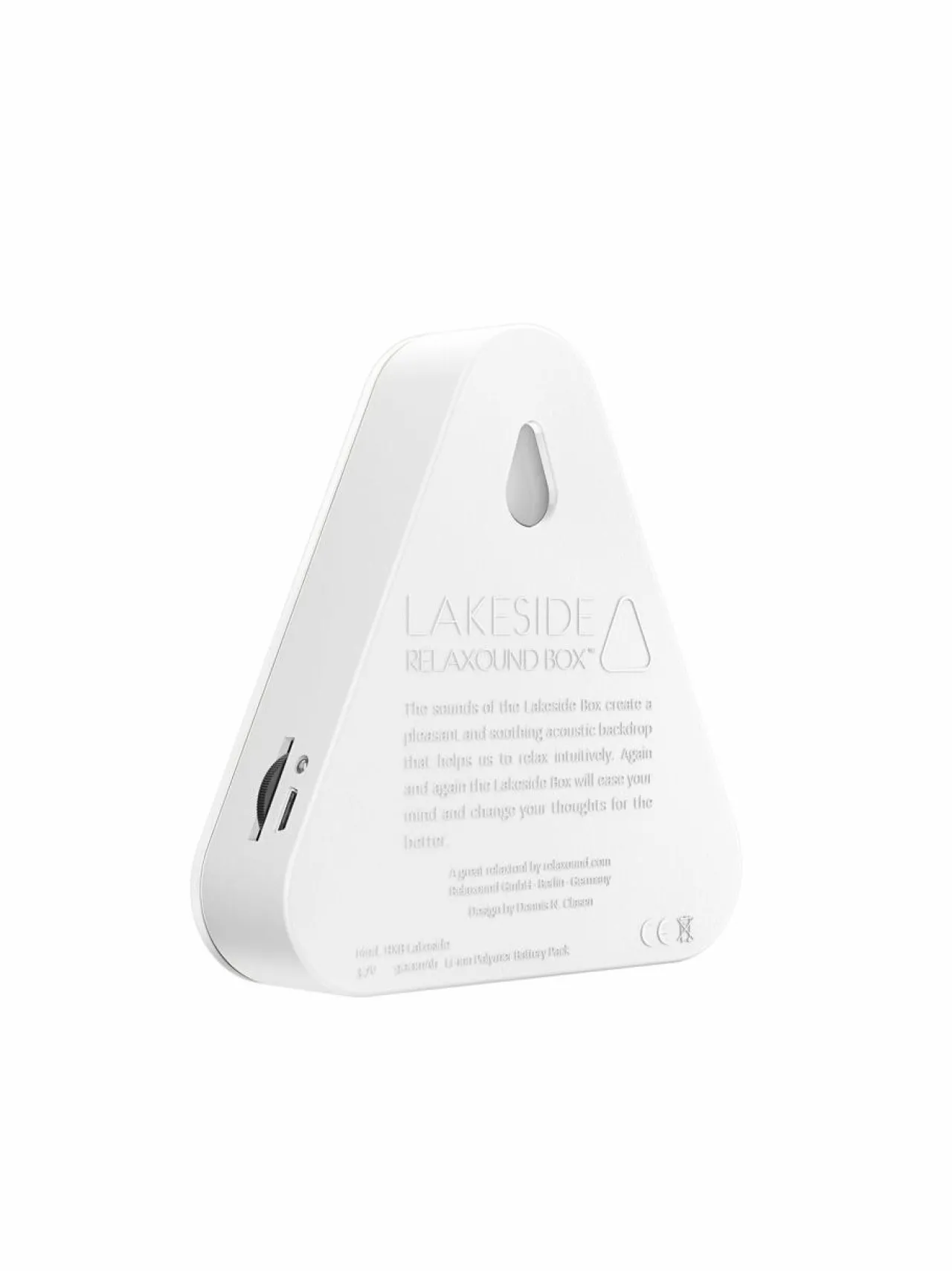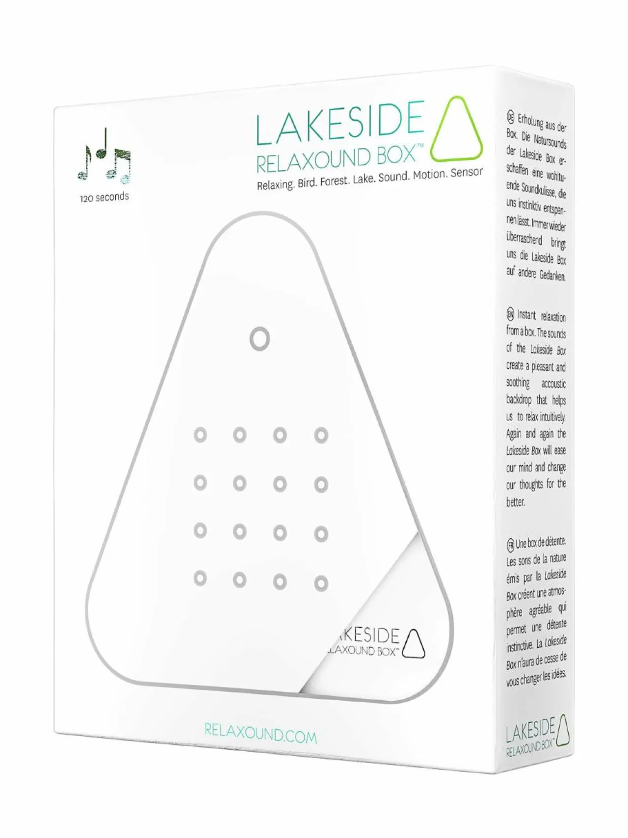 Relaxound Lakesidebox vie sinut järven äärelle. Kuuntele heinäsirkkojen, ankkojen ja järven ääniä ja hengitä syvään. Järviboxi vie sinut rentoutumisen tilaan ja antaa vapauden tunteen. Aktivoituu liiketunnistimen kautta (reagoi valon muutoksiin) ja se toimii 2 minuuttia kerralla. Tuote on helppo ladata tuotteen mukana tulevalla USB kaapelilla. Kosteusluokitus: IP44, käy sisä ja ulkotiloihin.