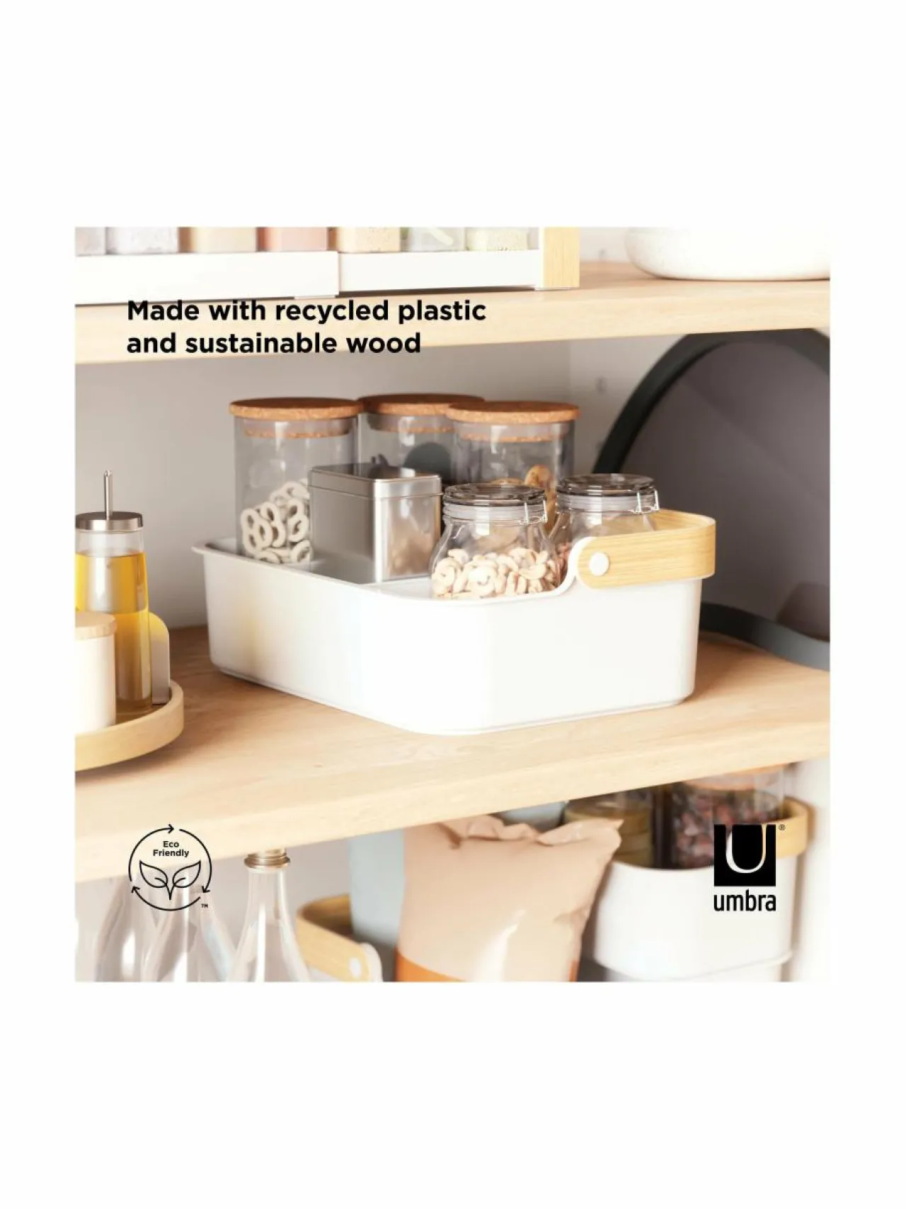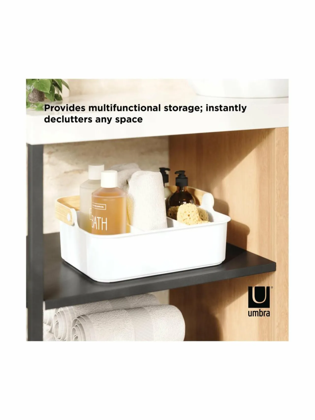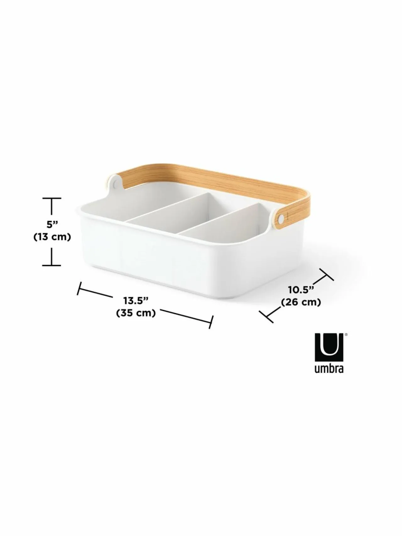 Umbran säilytyskori on pinottava ja käytännöllinen ratkaisu tavaroiden järjestelyyn. Sopii mainiosti keittiöön, kylpyhuoneeseen tai muihin kodin tiloihin. Säilytysrasiassa on kaksi irrotettavaa tilanjakajaa, joten pystyt helposti mukauttamaan sen erikokoisille tavaroille. Sen voi pinota päällekkäin ja säästää näin tilaa. Moderni ja minimalistinen muotoilu sopii monenlaiseen sisustustyyliin. Säilytysrasia kestää hyvin kosteutta, joten se on loistava ratkaisu kylpyhuoneeseen.