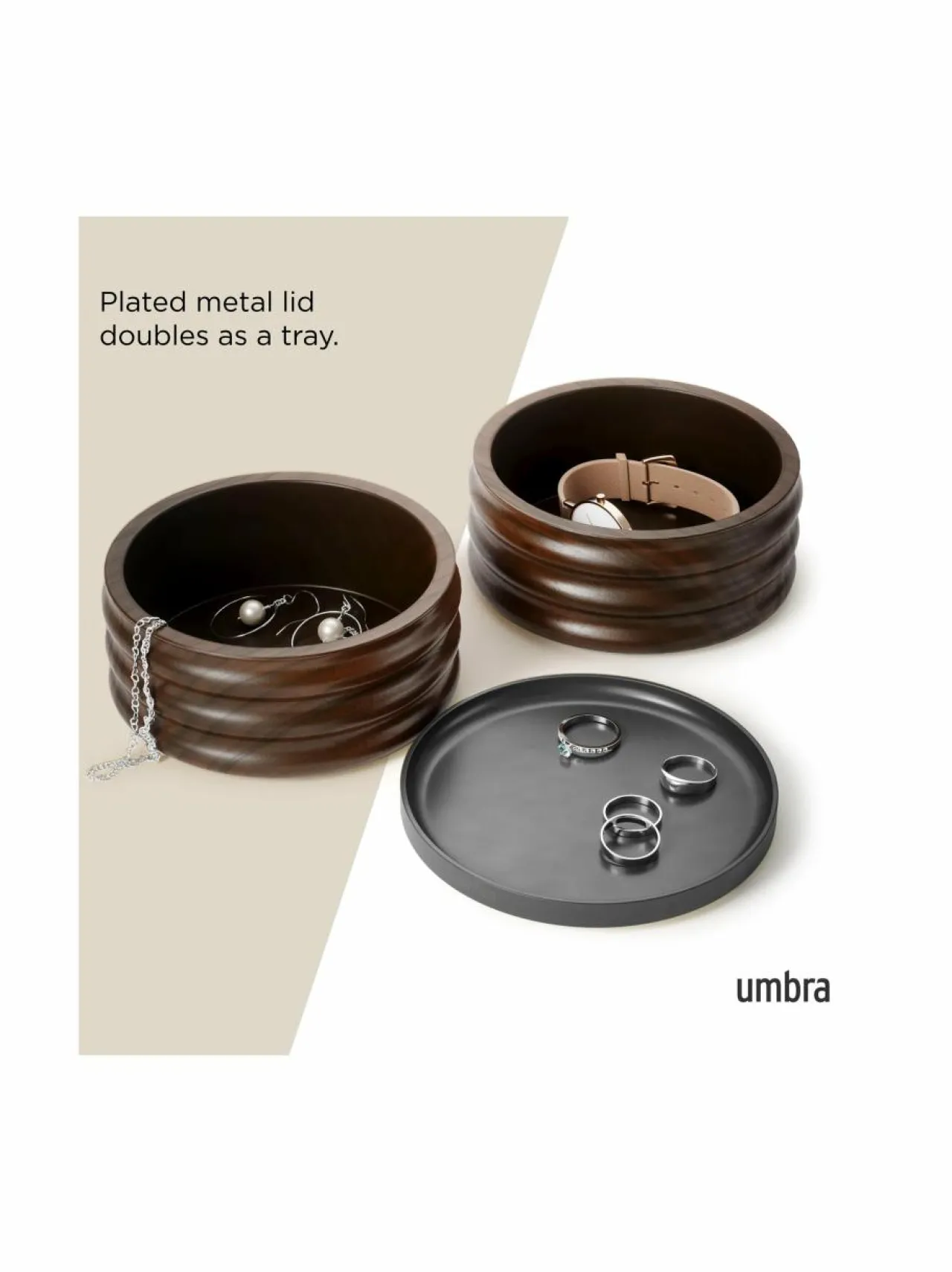 Umbran Tesora-säilytyslaatikko on moderni ja käytännöllinen ratkaisu korujen ja muiden pienesineiden säilytykseen. Laatikko on valmistettu kestävästä kumipuusta. Mukana tummansävyinen kansi. Laatikossa on kaksi pinottavaa osastoa, joihin voit säilyttää koruja, kelloja, rannekkeita ja muita pieniä esineitä.