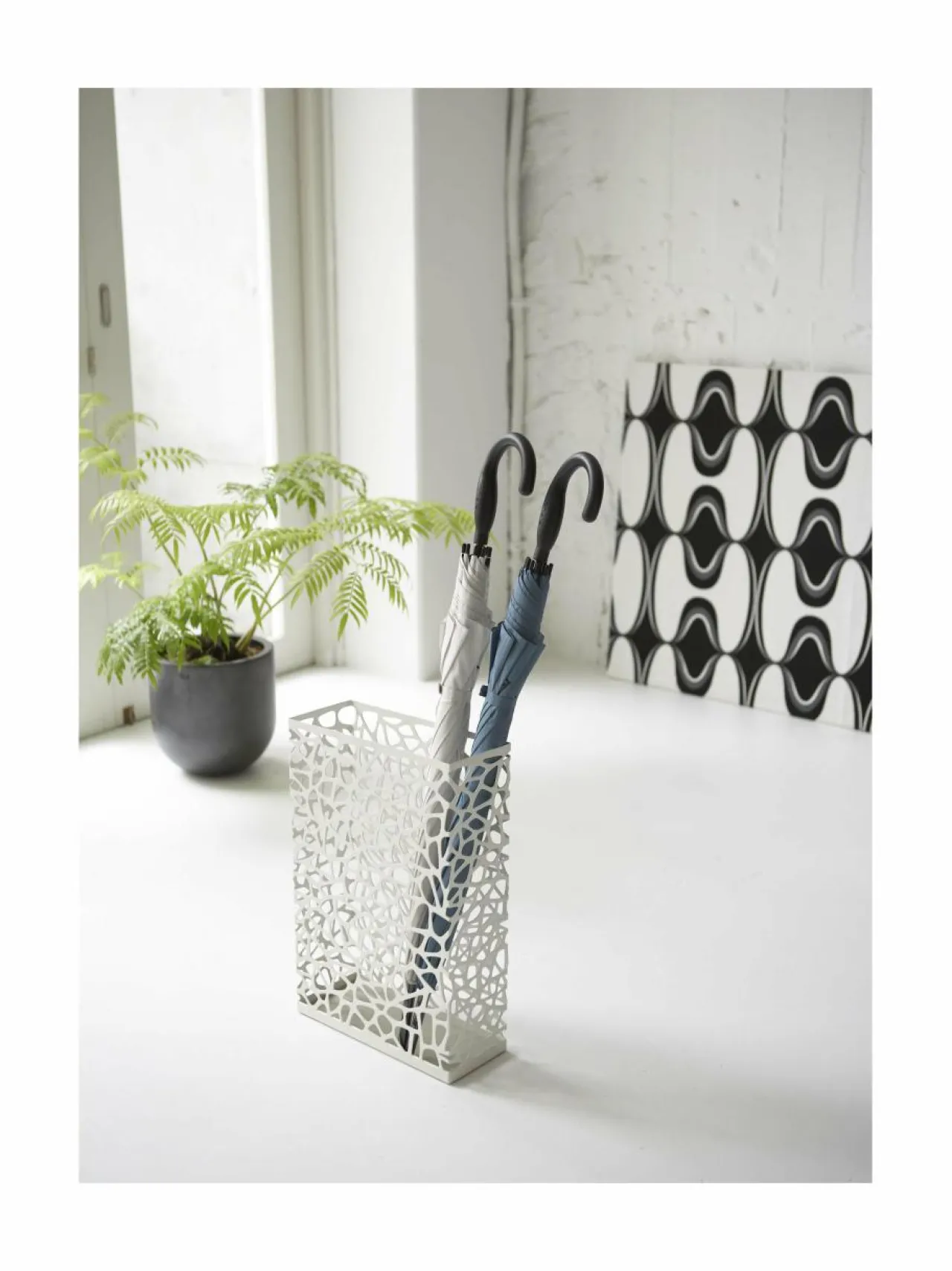 Yamazakin Nest-sateenvarjoteline on näyttävä sisustuselementti eteisessä. Verkkokuvioinen sateenvarjoteline on valmistettu mattapintaiseksi maalatusta teräksestä ja sen tyylikäs design sopii monenlaiseen sisustukseen. Telineeseen mahtuu jopa 8 sateenvarjoa. Suunniteltu Japanissa.