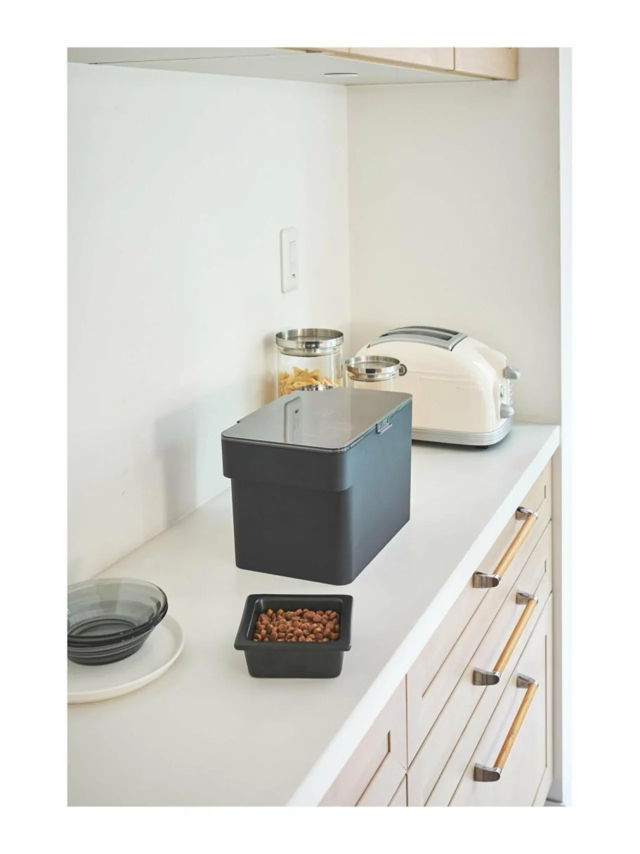 Tower-sarjan tyylikkäässä lemmikinruokalaatikossa on ilmatiivis kansi, joka ehkäisee tuoksujen ja kosteuden karkaamista sekä säilyttää kuivamuonan tuoreena ja maukkaana pidempään.