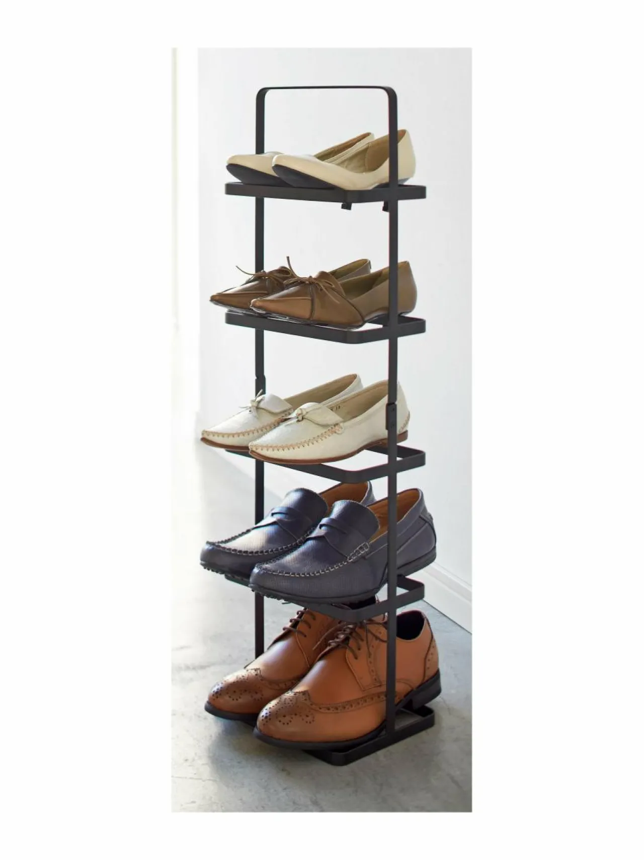 Kooltaan kompakti Yamazaki Tower Shoe Rack -kenkähylly sopii vaivatta kapeaankin eteiseen, vaatehuoneeseen tai kaappiin. Kevyt, teräsrunkoinen teline on helppo nostaa ja siirtää paikasta toiseen. Hyllyyn mahtuu viisi paria kenkiä. Tuote on koottava. Suunniteltu Japanissa.