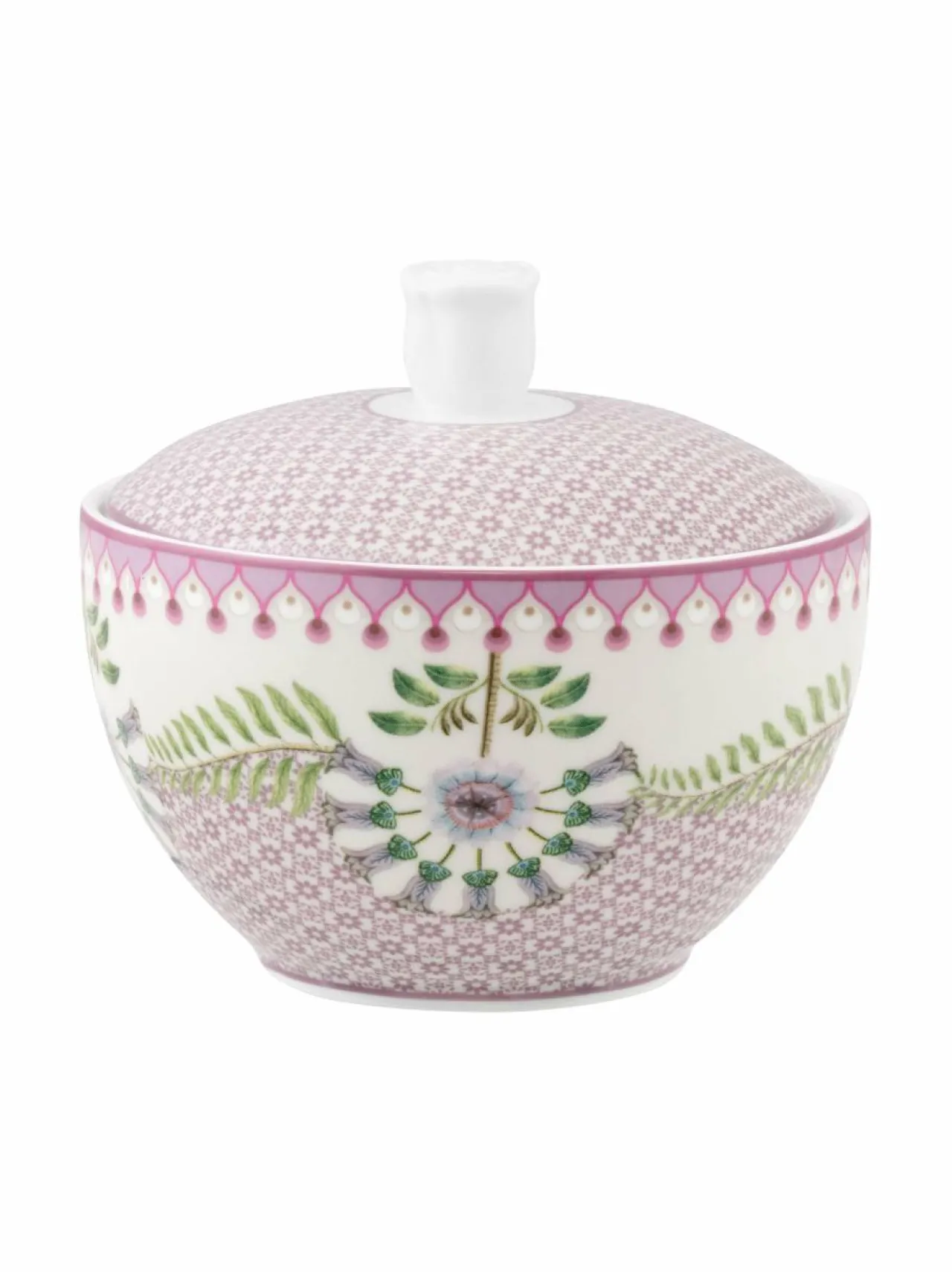 Värikkäällä kukkakuviolla tyylitetty sokeriastia. Valmistettu korkealaatuisesta posliinista. Halutessasi voit täydentää kattausta muilla Lily&Lotus -sarjan astioilla.