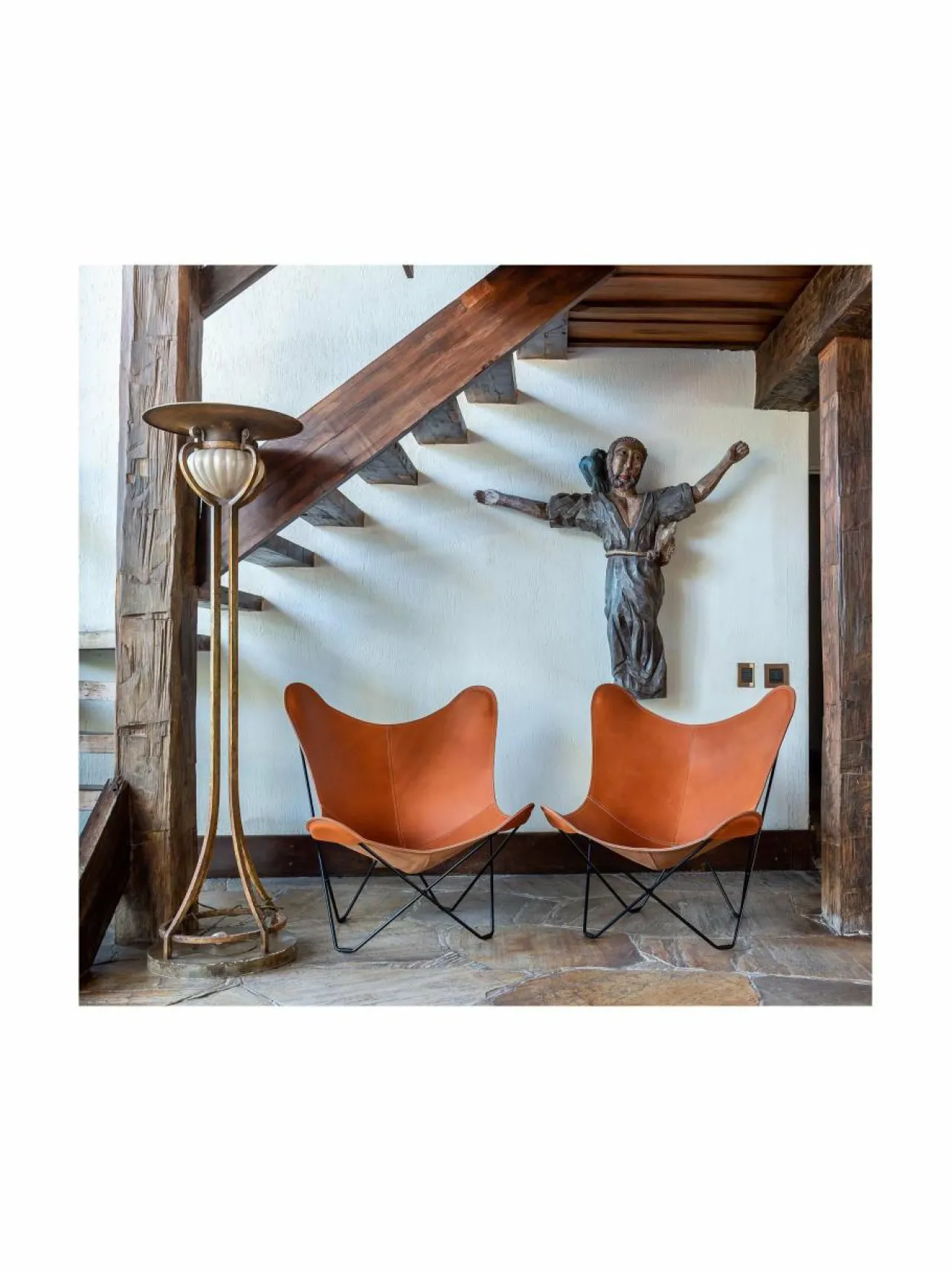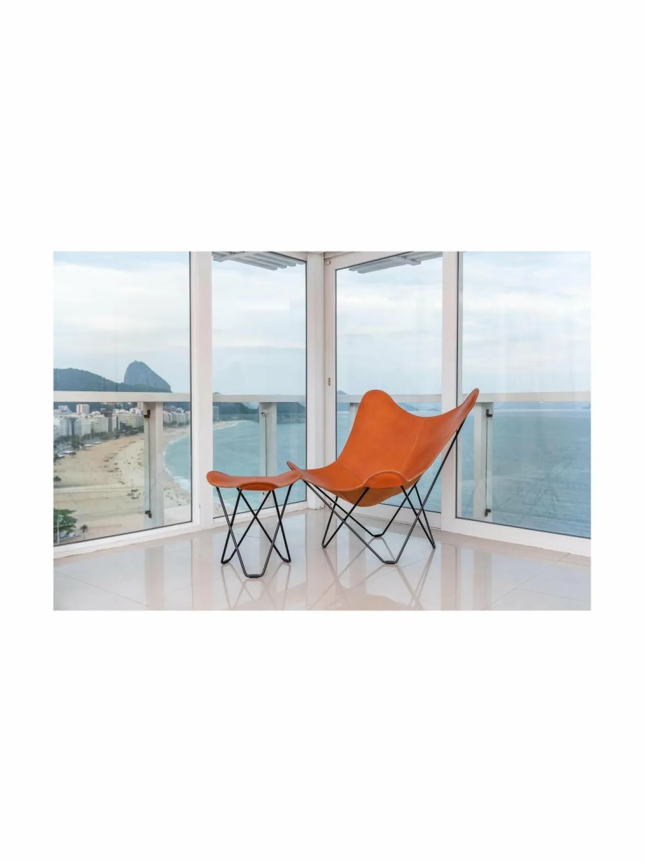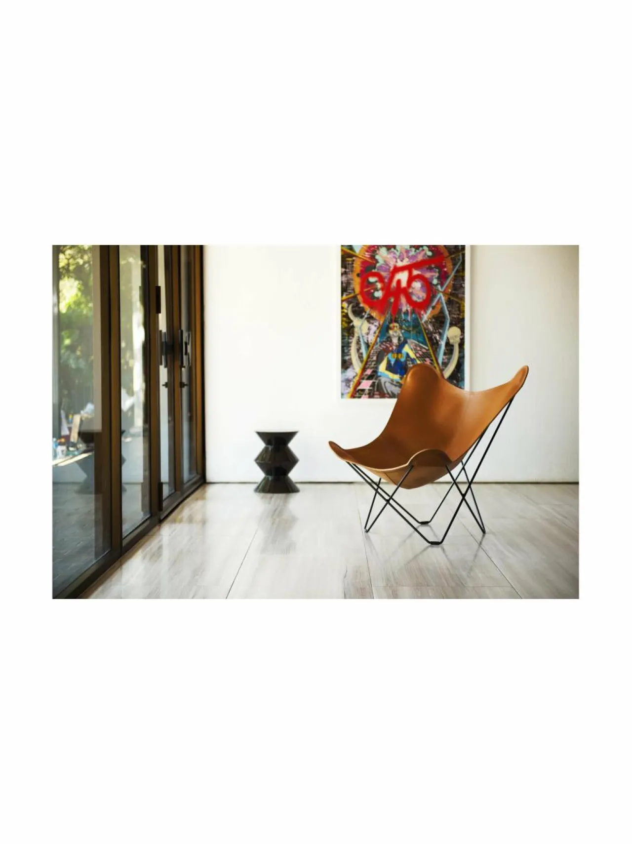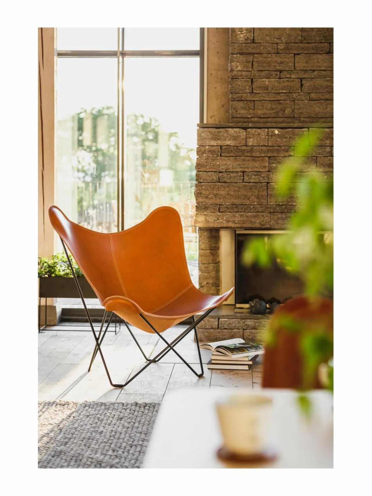 Cueron klassinen Pampa Mariposa -lepakkotuoli henkii 50-luvun muotokieltä. 12 mm vahvaan teräsrunkoon kiinnitettävä verhoilu on kasviparkittua italialaista satulanahkaa. Mukana tulevat lattiasuojat.