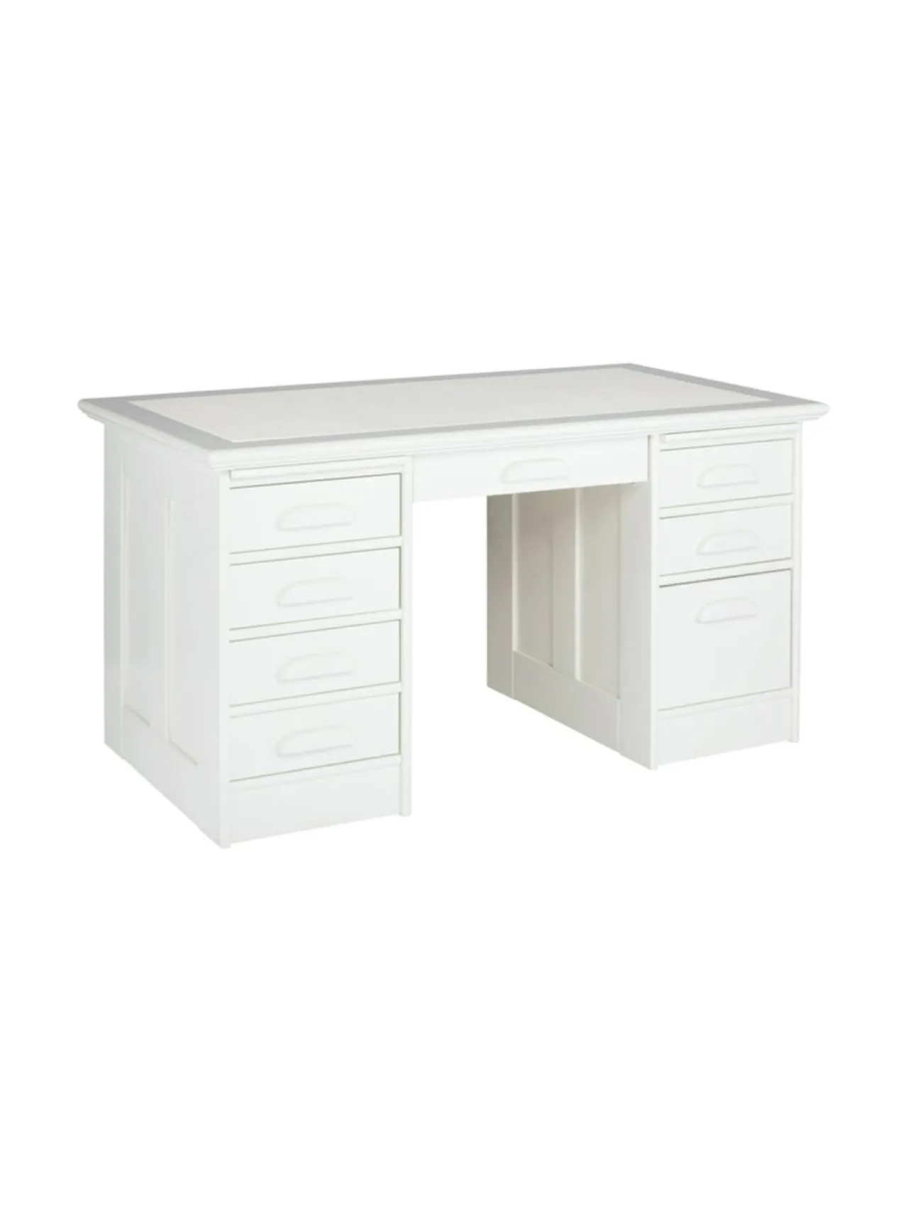 Tuotteen mitat ovat: leveys 140cm syvyys 76cm korkeus 77cmTuotenumero616011 Materiaalikoivu, vaneri, tekstiilinahka Hoito-ohjeetNihkeäpyyhintä nukkaamattomalla siivousliinalla VäriLUMIVALKOINEN AvainsanatTyöpöytä, Kirjoituspöytä