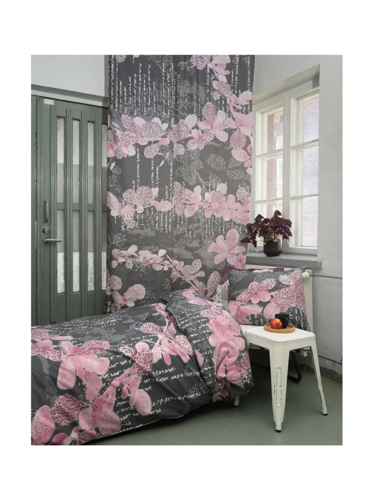 Jälki-kuosinen verho on paksusta puuvillasta valmistettu näyttävä ja elegantti sisustuksen komistaja. Kasviaiheiden ja graafisten elementtien yhdistelmä sopii upeasti skandinaaviseen sisustukseen. Terhi Laitakarin suunnitteleman Jälki-kuosin verhojen värivaihtoehtoja saatat joutua hetken puntaroimaan, koska hehkeä, hehkuvan ja eteerisen väliltä saattaa olla vaikea valita. Jälki-verhon värivaihtoehdot ovat siis: hehkeä purppura, hehkuva oranssi sekä eteerinen roosa.
