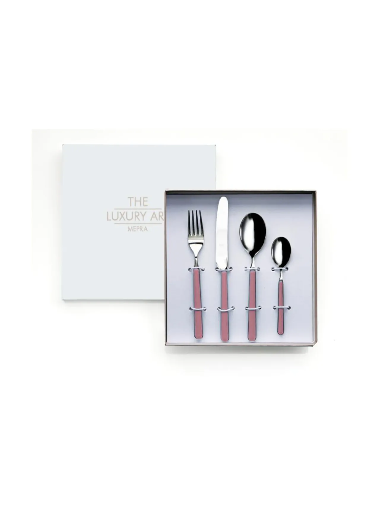 5 värisävyä lasten mieleen! Lasikuidulla rikastettu hartsinen kahvaosa takaa lasten aterinsetin kestävyyden ja värien kirkkauden monien pesukertojenkin jälkeen. Kahvan hartsiosat ovat ultraäänihitsattuja mikä tekee kahvaosasta pitkäkestoisen. Setti sisältää lasten käteen sopivan ruokalusikan, ruokahaarukan, ruokaveitsen ja pienen lusikan. Materiaali ruostumatonta terästä, kahvaosat hartsia. Konepesunkestävä. Valmistettu Italiassa.