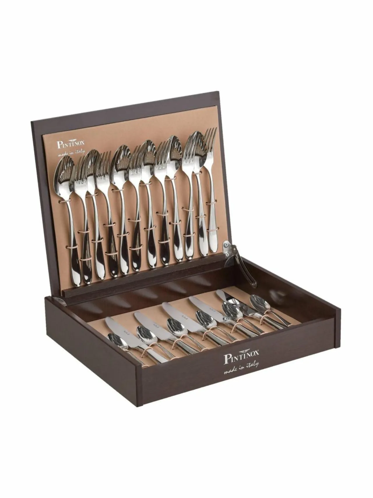 Pintinox on perinteikäs, vuonna 1927 perustettu italialainen tuotemerkki, joka tunnetaan parhaiten aterimistaan. Palladium-aterinsettiin kuuluu 6 kappaleen sarjat haarukoita, veitsiä, lusikoita ja pikkulusikoita. Aterimet on pakattu tyylikkääseen puulaatikkoon.