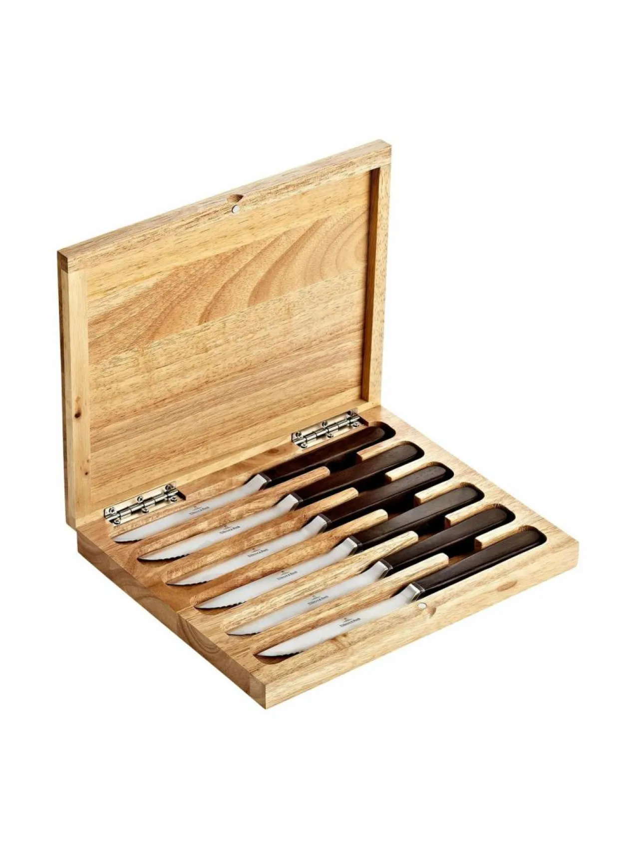 Tyylikäs puurasia sisältää kuusi sahalaitaista pihviveistä. Veitset on valmistettu ruostumattomasta teräksestä, kahvat ovat puuta. Käsinpesu.