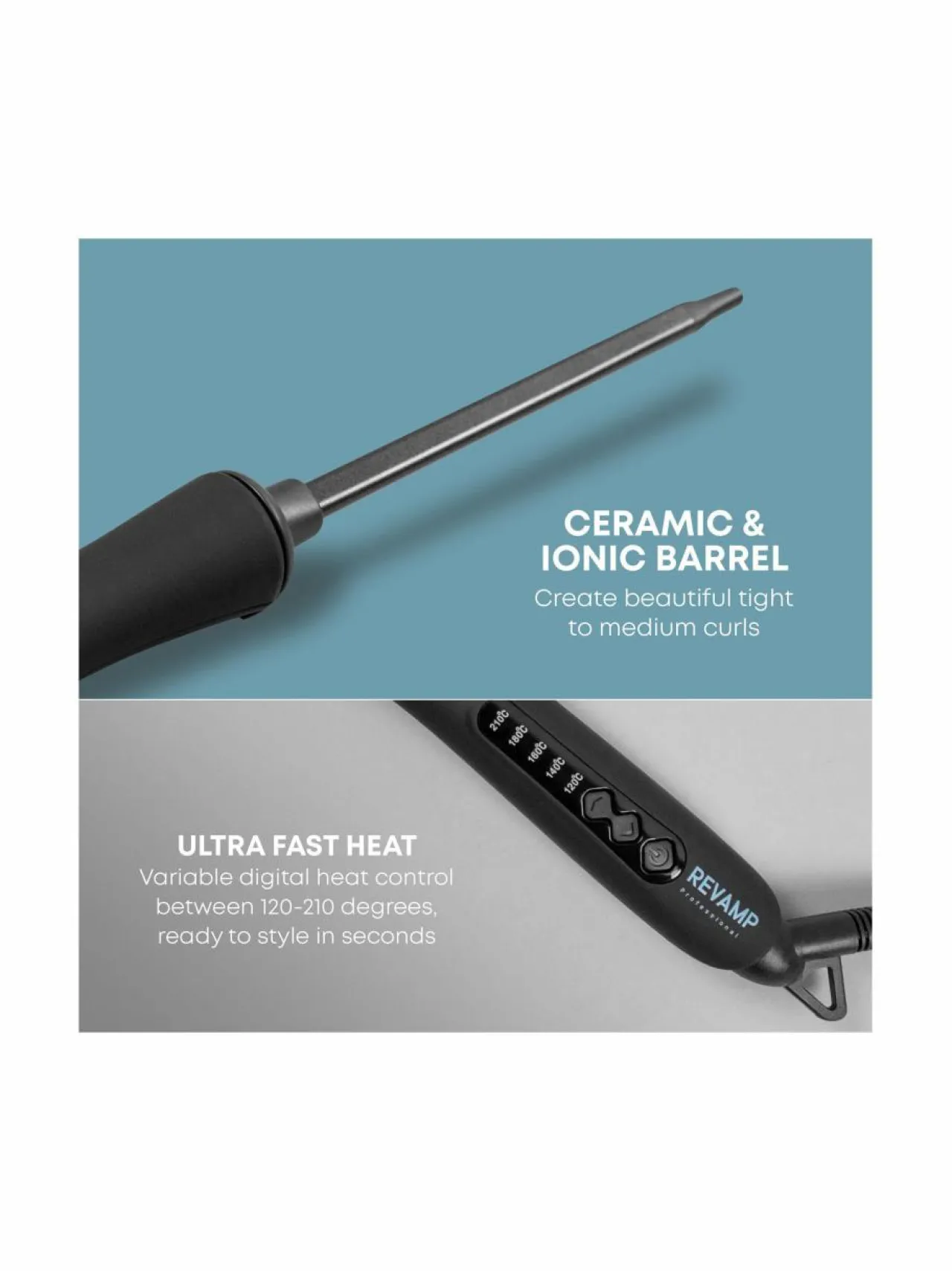 Revampin 10 mm:n Progloss-puikokihartimella syntyy upeat pienet ja kestävät kiharat. Kiharrin lämpiää nopeasti, ja lämpötilan voi valita väliltä 120–210 °C. Keraaminen puikko on käsitelty keratiinilla sekä argan- ja kookosöljyllä. Tämä suojaa hiuksia, tehden niistä kiiltävät ja terveen näköiset. Kihartimessa on kolmen metrin pituinen kääntyvä virtajohto, joka helpottaa käyttöä. Pakkauksen mukana tulee lämpöhansikas.