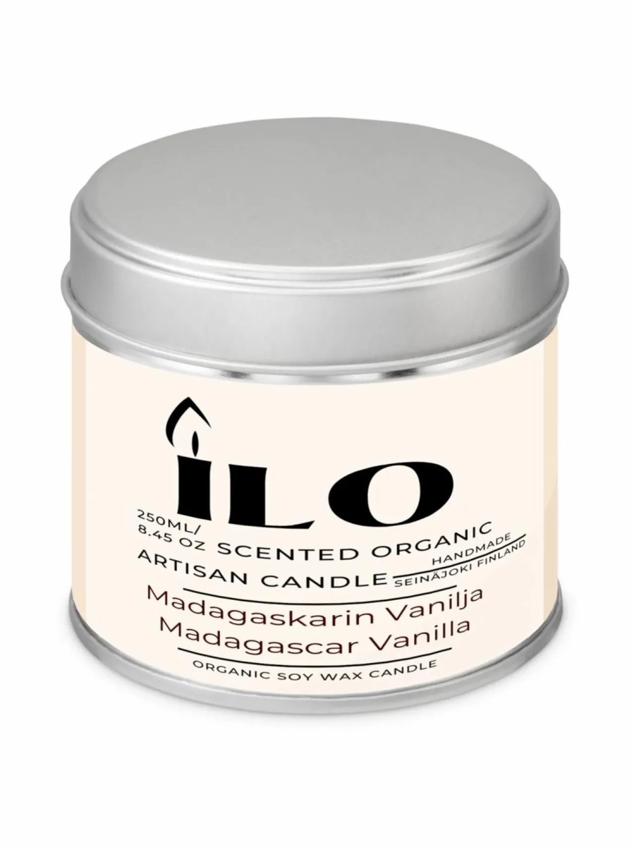 ILO Luomu Soijavaha Tuoksukynttilä Madagaskarin Vanilja on 100% luomu soijavahasta käsinvalmistettu astiakynttilä.