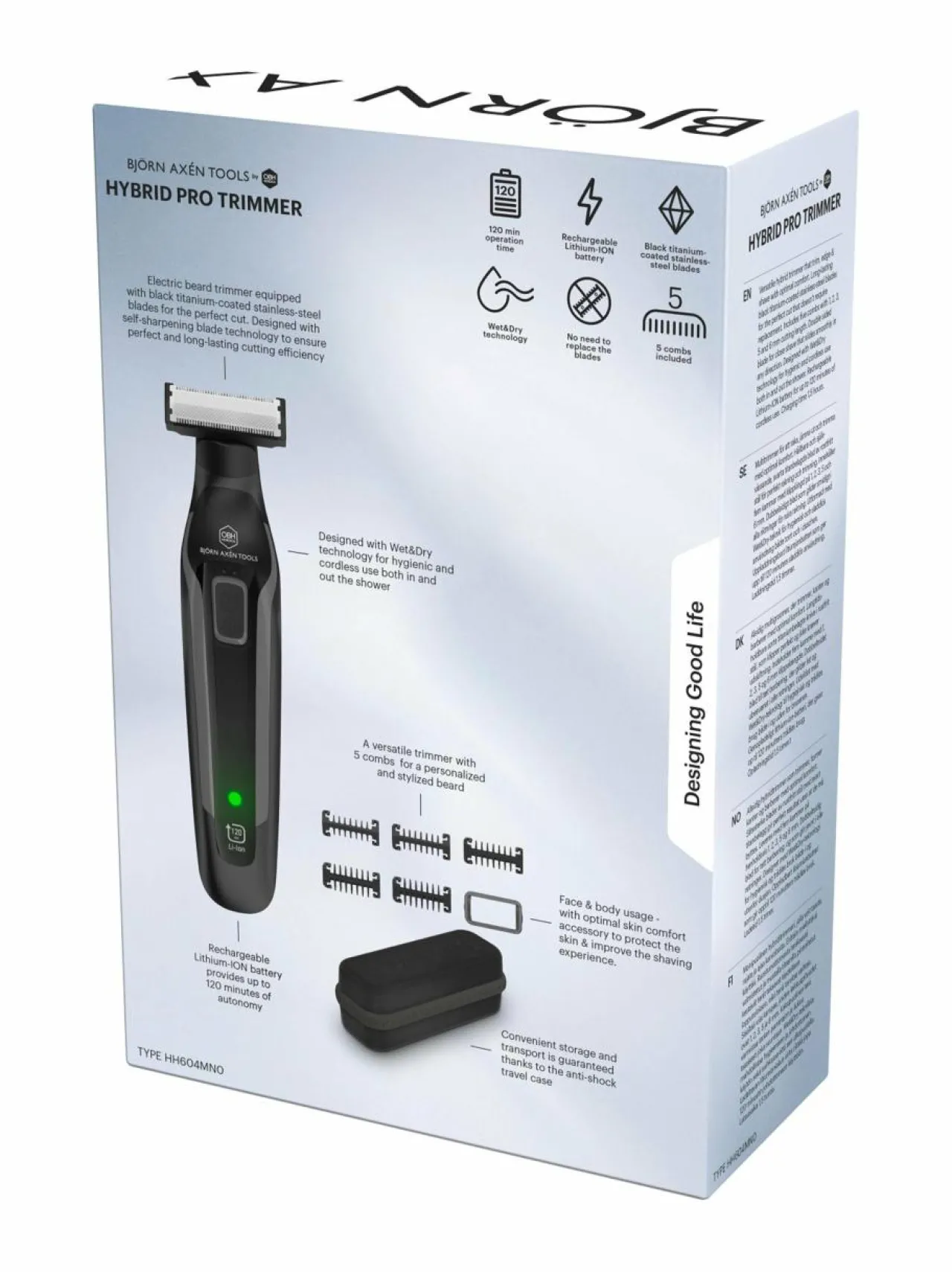 Björn Axén Tools Hybrid Pro Trimmer on monitoimitrimmeri, joka sopii käytettäväksi parran trimmaamiseen ja ajamiseen sekä hiusten siistimiseen ja tasoittamiseen. Sen titaanipinnoitetut, ruostumattomasta teräksestä valmistetut kestävät ja itseteroittuvat mustat terät takaavat täydelliset tulokset parranajossa ja trimmaamisessa. Itseteroittuvien terien ansiosta sinun ei tarvitse koskaan vaihtaa teriä, mikä on hyväksi ympäristölle.Wet & Dry -tekniikka Björn Axén Tools Hybrid Pro Trimmer on varustettu Wet & Dry -tekniikalla, minkä ansiosta se sopii käytettäväksi myös suihkussa. Tämä takaa hygieenisen ja monipuolisen käytön.Hybrid Pro Trimmerin mukana toimitetaan viisi erilaista ohjauskampaa, joiden leikkuupituudet ovat 1, 2, 3, 4 ja 5 mm.